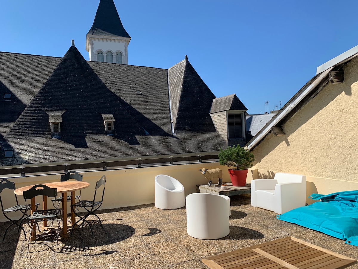 Studio au TOP, HYPER CENTRE PAU: quartier du Château avec VUE PLONGEANTE Pyrénées, meublé & rénové avec goût CLIMATISATION REVERSIBLE 3e étage PARKING GRATUIT 18h à 9h à 1' -coin TERRASSE: 2 grands poufs fatboy, coins salons détente & repas -coin cuisine: frigo/plaques/micro-ondes/machine Nespresso/grille pain/bouilloire/vaisselle ustensiles de cuisine -coin repas avec chaises -coin séjour-nuit: lit armoire faisant canapé/TV 80'/rangements/table basse et chaises -SDB:douche à l'italienne/WC