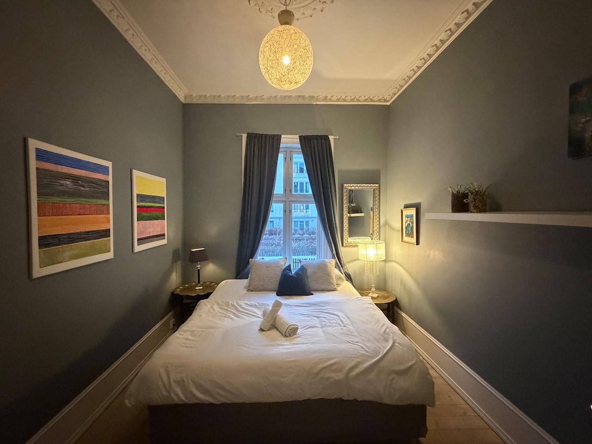Oppdag en lys og karakterfull leilighet med tre stilfulle soverom og fullt utstyrt kjøkken, perfekt for hyggelige måltider. Bad med dusj, og stort glasstak som slipper inn rikelig med dagslys. Klassisk stukkatur og originale tregulv gir boligen sjarm. Stor stue/soverom med TV og Chromecast gir et komfortabelt sted å slappe av, midt i byen. Flott og unik kunst er plassert rundt i leiligheten for å sette et unikt særpreg.