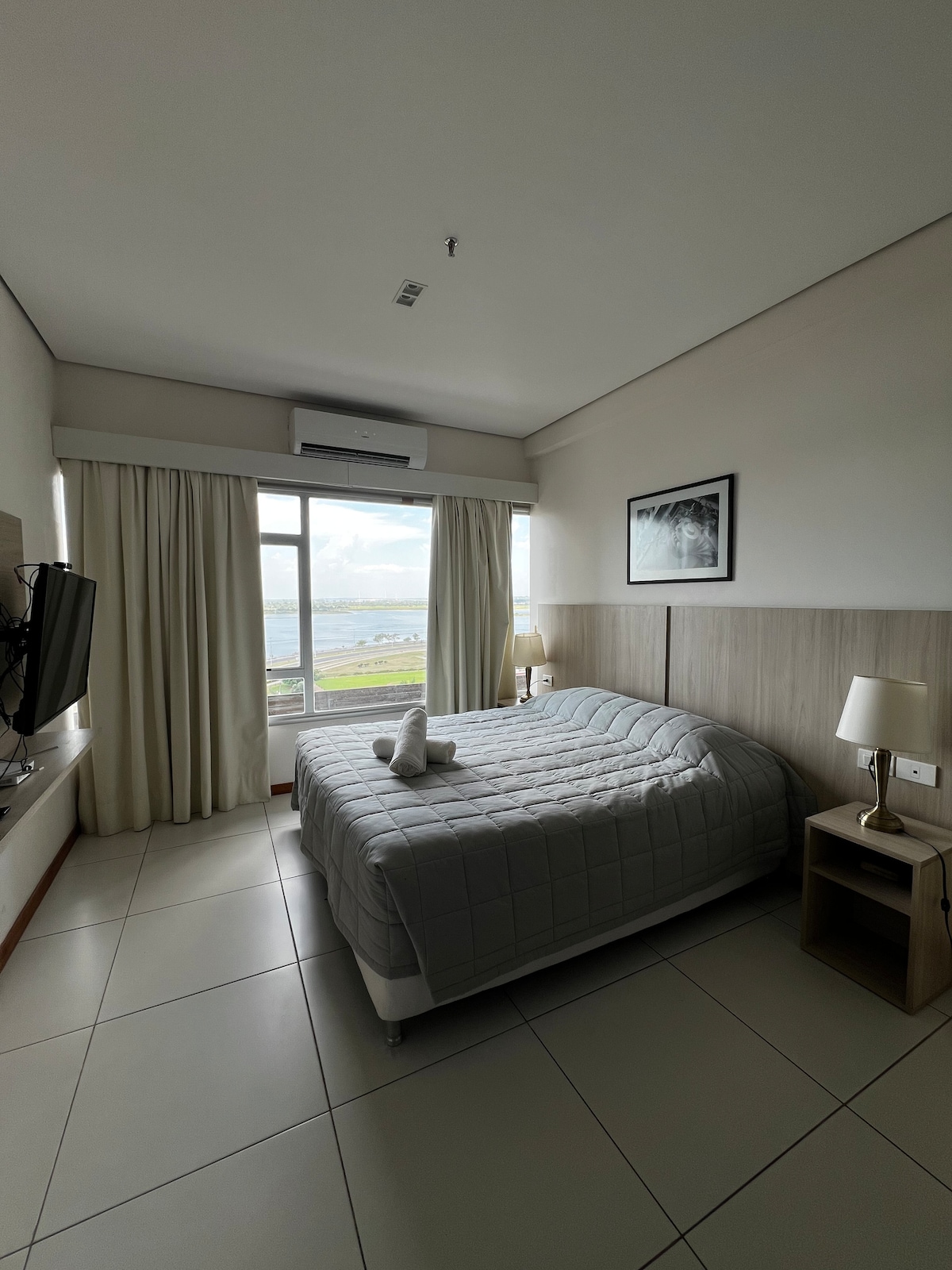 🛎️Recepción disponible las 24 horas del día. Departamento de un dormitorio totalmente equipado, ubicado en el centro de Asunción. Hermosa vista desde todos los ambientes. Cuenta con un dormitorio, un baño, vestidor, tocador, sala, comedor, cocina y área de lavado de ropa. Especial para estadías tanto cortas como extendidas. El departamento cuenta con 2 smart T.V., internet Wi-Fi, cama king size, vestidor, secador de cabello, toallas, ropa de cama, todo para cocinar, lavarropas, plancha.