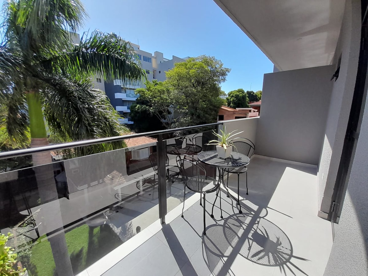 Disfruta de una experiencia en un barrio típico asunceno, en el centro de Asunción, c/ balcón y parrilla privada. Edificio con piscina y gym. Guardia de Seguridad 24 hs en el edificio. Zona residencial, cerca del microcentro, ideal para despejarse. Cerca de parques, locales comida, a minutos del centro típico de la ciudad. De fácil acceso, a una cuadra de la parada de colectivos. A 1.5 km del Estadio Def del Chaco. Ideal para partidos de Copa Liber y Suda