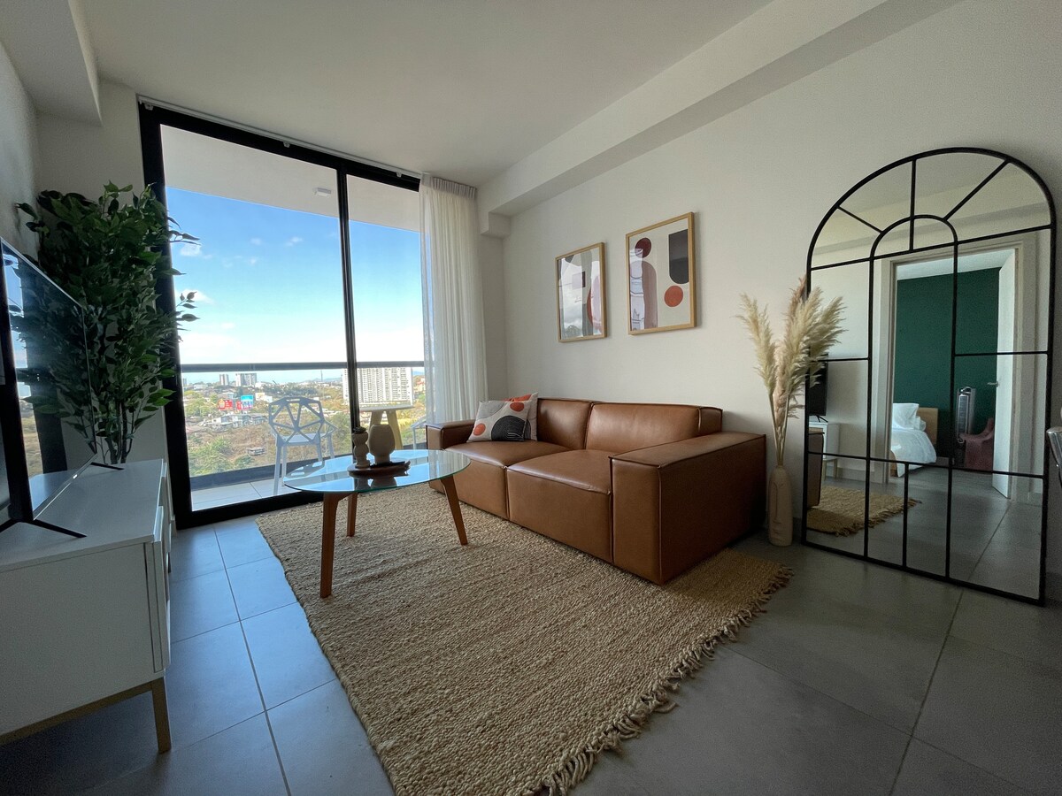 Enjoy the most beautiful view of the Sabana skyline as the sun sets from the luxury of our 16th-floor apartment in the newest and most equipped tower in Sabana. Relax in this peaceful setting, where you can watch and hear the river and its birds from the boho chic style balcony while surrounded by nature, just a short stroll from Sabana Park in San José, ten minutes walking from a grocery, and 15 minutes driving from the airport. Discover our apartment's elegance, smart appliances and design.