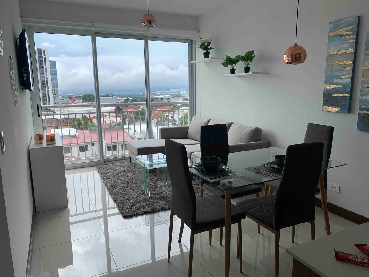 Cozy apartment on the 18th floor of the modern "Cosmopolitan Tower". Enjoy amazing views, a peaceful and safe place. For your convenience parking is within the building. Enjoy the better quality coffee. Quite close to Juan Santamaría Airport. (SJO). Awesome amenities, great location, close to lovely parks, national stadium, a variety of restaurants, grocery store, banks, among other places. Enjoy it!