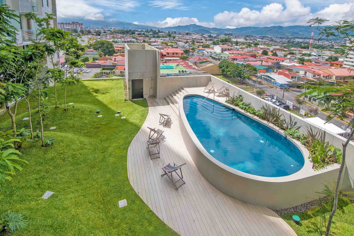 Luxury apartment with A/C, cozy, and perfectly located in the heart of the city. This fully equipped space, with modern and elegant decoration, offers you the freedom to live safely and comfortably while exploring everything the city has to offer. Close to tourist attractions, banks, supermarkets, and restaurants. (The condominium has 8 restaurants within the facilities) The International Airport (SJO) is 20 minutes away, La Sabana Park and the new National Stadium are 3 min away in San Jose.
