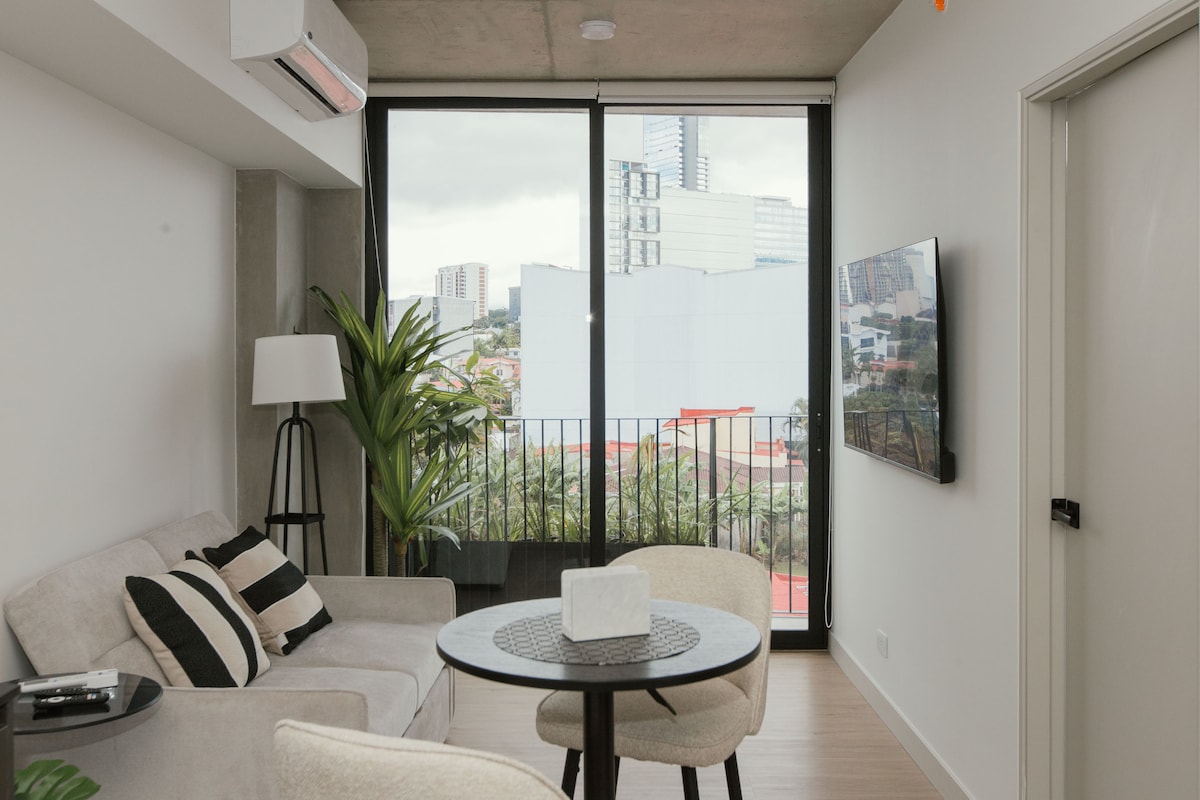 Brand new luxury apartment at Nucleo Sabana. It has a minimalist style with all the appliances brand new, including A/C, 2 smart TVs. High speed internet with TVservice. Laundry room includes a washer/dryer, 2 in 1. It has a wonderful view to the top of the trees and the sky in the balcony. There is a river next to it so you can always enjoy the river sound. Complex: More than 30 amenities, including a gastronomic market(NucleoGastro). Located 10min from Juan Santamaría Int’l Airport (SJO).