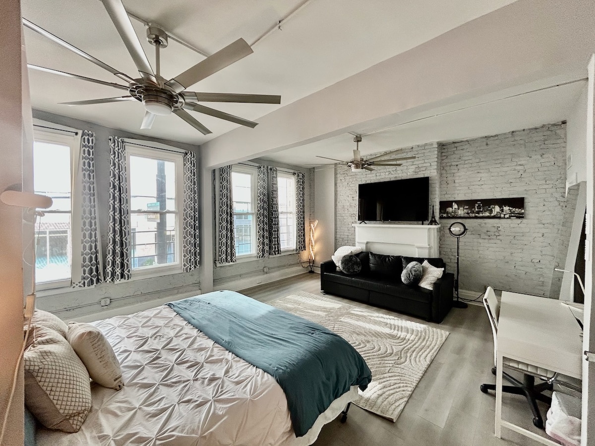 Welcome to our newly remodeled & charming centrally located apartment! As you step inside, be captivated by the exposed brick walls that add a touch of rustic elegance. The apartment boasts 20-foot ceilings, creating an open and airy atmosphere. Take advantage of the streetcar stop located just outside, ensuring seamless transportation to all major attractions then come home and relax in the plush king-size bed after a day of exploring the city. Book now and indulge in comfort and convenience!