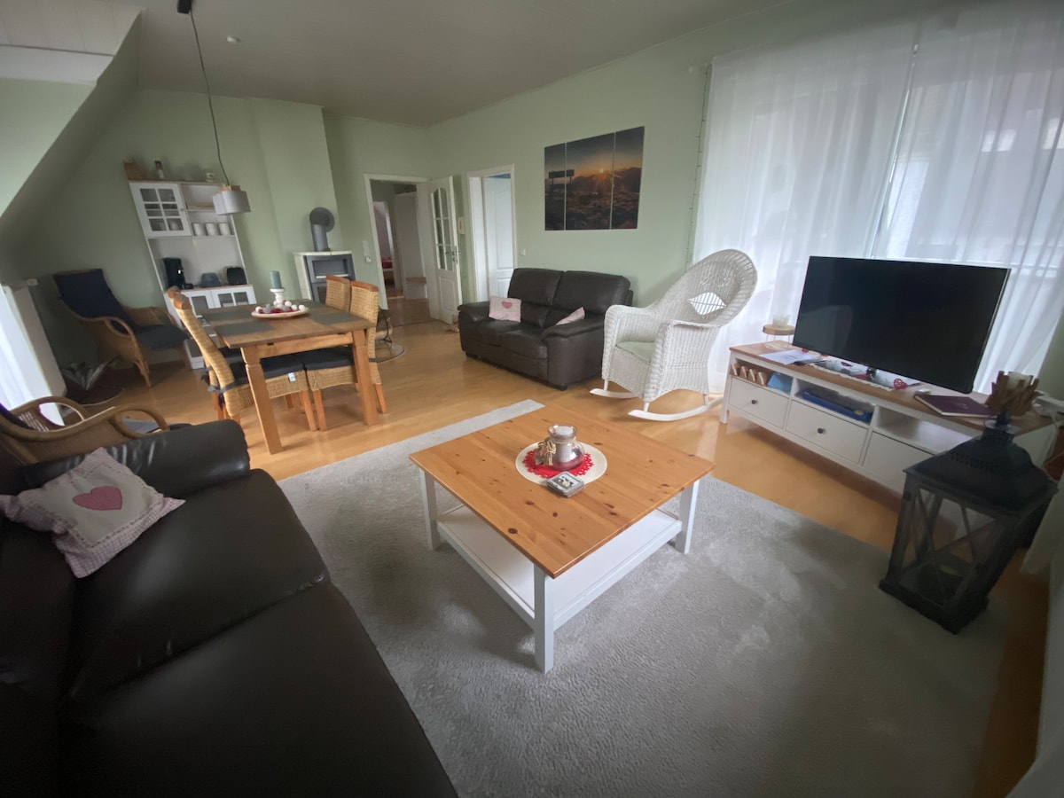 Entspannt euch in unserer besonderen und ruhigen Unterkunft! Das neu eingerichtete Apartment für bis zu 4 Personen mit ca. 60 qm verteilt sich auf zwei Etagen. Hervorzuheben sind eine vollausgestattete Küche, TV, Schlafcouch, große Panoramafenster, ein gemütliches Boxspring-Bett, die eigene Terrasse mit Außenbestuhlung sowie ausreichend Kundenparkplätze. Das Panoramafenster der Ferienunterkunft ist Richtung Sonnenaufgang und Wald ausgerichtet. Wir freuen uns auf euren Besuch!