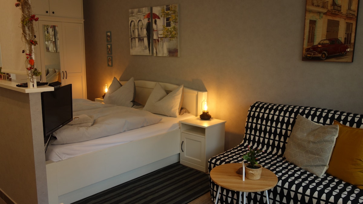 Ganzes, unabhängiges Atelier, 52 qm, mit gut ausgestatteter, integrierter Küche, Flur und Bad. Die Lage ist ideal, wenn man Eisenach, die Wartburg oder auch die Wandermöglichkeiten zu Fuß erkunden möchte. (Bachhaus Museum, Markt u. Lutherhaus 10-15 Min., Wartburg: ca.35Min. (Waldweg), Bahnhof: ca.15 Min. Wandern: Direkt hinter dem Haus beginnt der Wald und viele Wandermöglichkeiten in nächster Nähe. Ich gebe gerne Tipps und Infomaterial. Die Fenster des Ateliers gehen zum Hof, der zum Teil begrünt, zum (großen) Teil als Parkplatz dient. Verschiedene Restaurants und Cafés liegen auf dem Weg zur nahegelegenen Innenstadt (in etwa 6-10 Minuten zu Fuß zu erreichen). Das umgebende Südviertel ist die bevorzugte Wohnlage Eisenachs und alleine wegen seiner vielen Jugendstil-Villen sehenswert. Im Winter ist der historische Weihnachtsmarkt auf der Wartburg ein besonderes Erlebnis (an allen Wochenenden im Advent). Ist der nahegelegene Prinzenteich ( 2Min. ) zugefroren, wird er von Klein und Groß zum Schlittschuhlaufen besucht! Das Atelier ( non-smoking), das aus einem großen Raum mit integrierter Küche besteht, bietet auf einem bequemen Schlafsofa Platz für 2 Personen (1,40m x 2,00m). Da immer wieder Anfragen kommen, besteht nun die Möglichkeit eines 3. Schlafplatzes auf einer Gästematratze. Kaffee und verschiedene Sorten Tee stehen frei zur Verfügung. Bettwäsche, Handtücher und Fön sind vorhanden. Ausserdem selbstverständlich: Spülutensilien/Geschirrtuch, Toilettenpapier, Seife, Shampoo/Duschbad. Gästen, die mit dem Auto anreisen, steht ein privater Parkplatz direkt vor dem Eingang zur Verfügung. Notice: actually the studio is not available on wednesdays, (arrival wednesday-evening is sometimes possible). Exception: school-holidays. Hinweis: mit Ausnahme der Thüringer Schulferien und Feiertage wird das Atelier mittwochs von 16-18 Uhr nicht zur Verfügung stehen. Sollte euer Aufenthalt einen Mittwoch umfassen, bekommt ihr ein leckeres Frühstück als kleine Entschädigung. Teilt mir einfach euren Wunschtag dafür vor der Anreise mit.