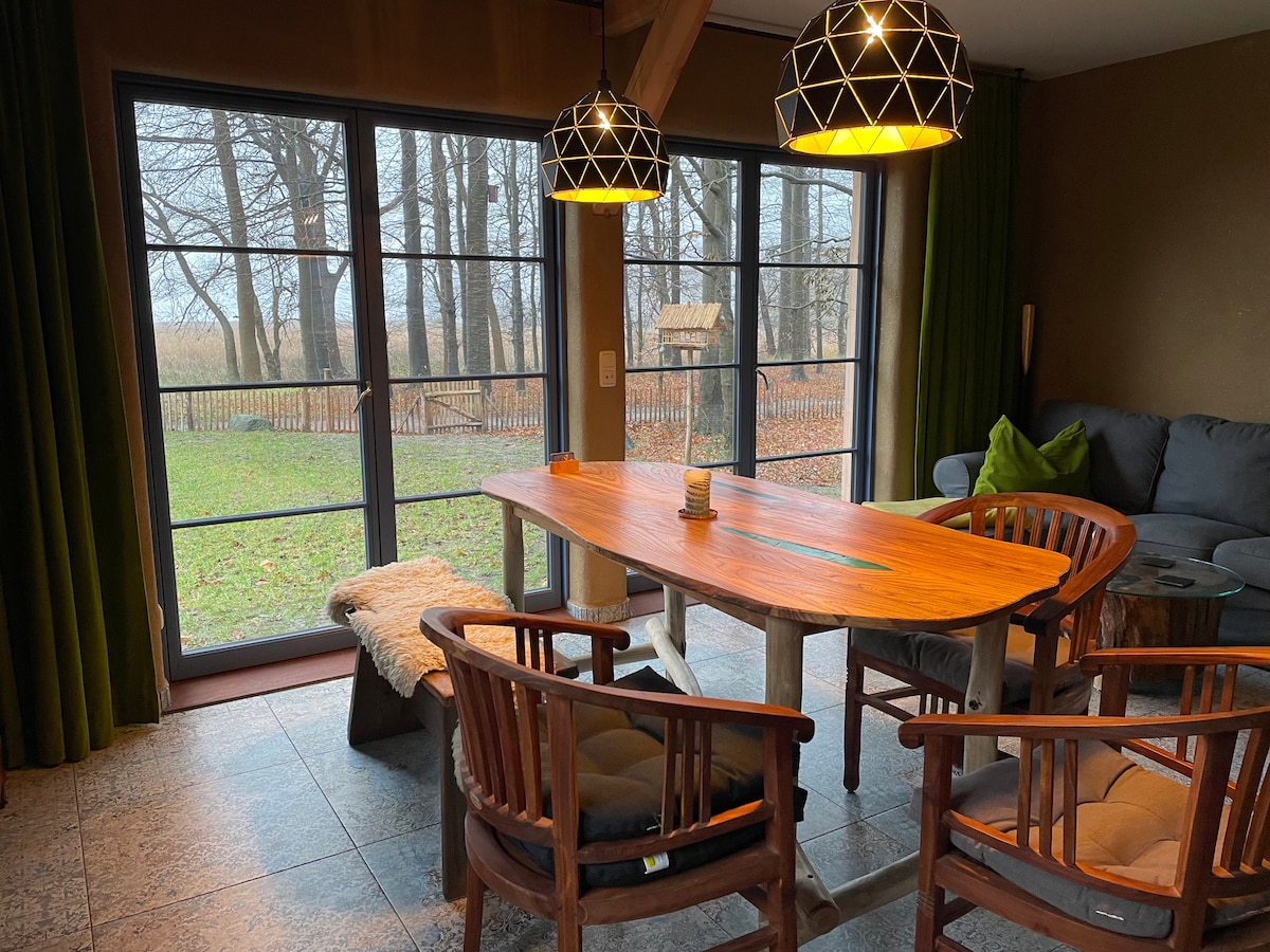 ... look out of your bed onto the water, enjoy the peace and quiet and listen to the rustle of the beech forest, experience bike tours directly on the water and enjoy nature. A beautiful, modern and rustic, low-energy half-timbered house with thatched roof, Moroccan tiles, oak floorboards and clay plaster walls awaits you. For activities there is a beautiful large garden with a forest swing, free steam sauna, outdoor shower and tub, a standup paddle, a paddle boat and 4 bicycles.