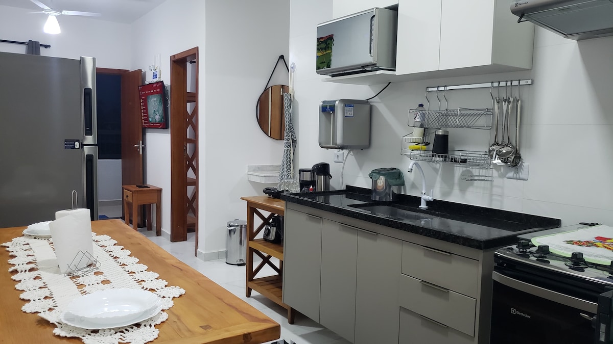 Apto mobiliados c/ 1 dorm, SMARTV de 32', cozinha com geladeira, fogão, microondas, liquidificador, panelas, pratos, copos, talheres, utensílios em geral, ventilador de teto ou de parede e Ar Condicionado, banheiro, área de serviço com tanque e varal, internet wi-fi. Churrasqueira, espaço kids, ducha e estacionamento fechado. É necessário trazer roupa de cama, mesa e banho. Prezamos por manter um AMBIENTE BASTANTE TRANQUILO E FAMILIAR; residimos na casa ao lado para melhor atendê-los.