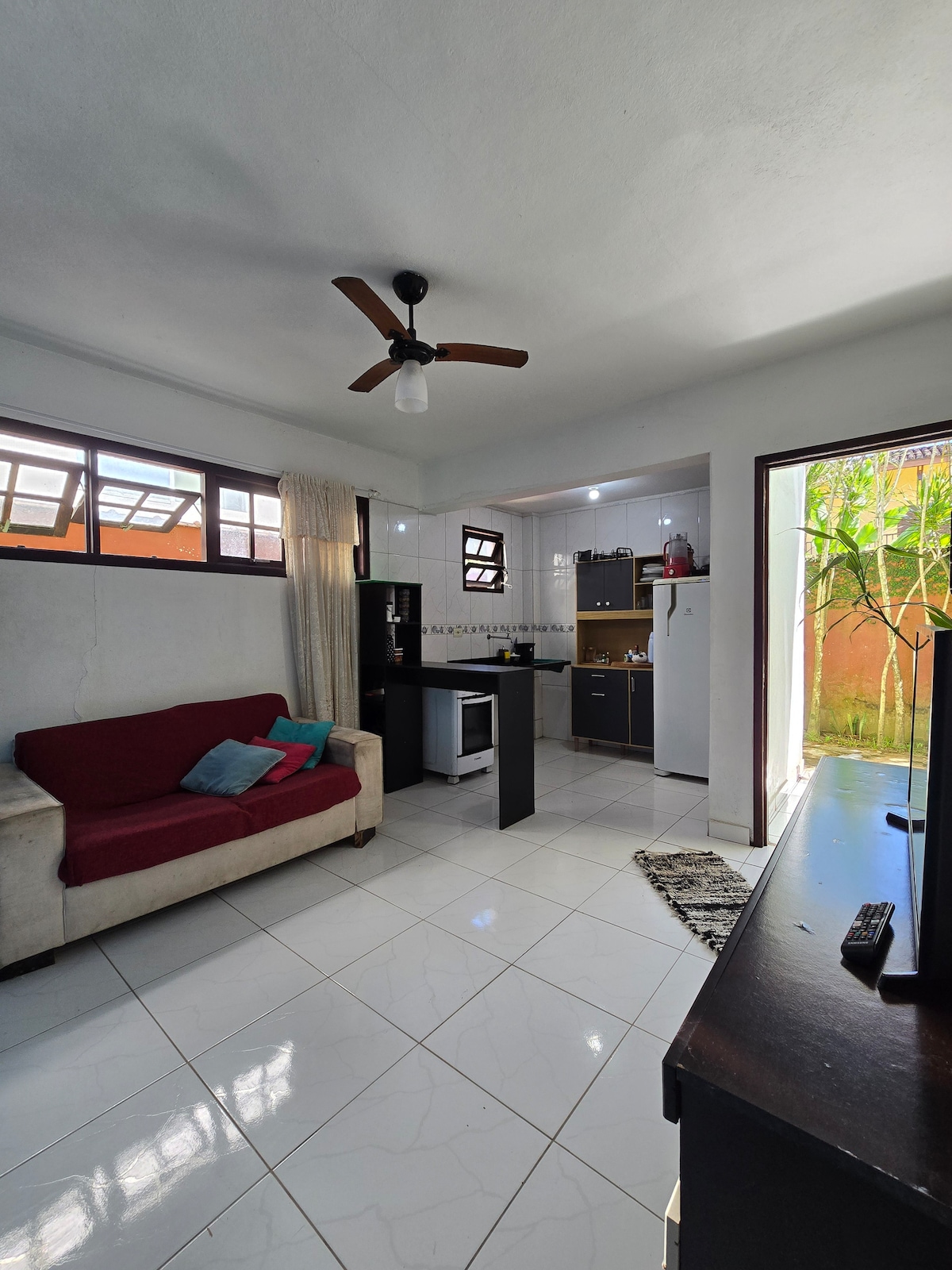 O chalé fica em um condomínio intimista com apenas 6 unidades, tendo uma piscina de uso coletivo. Nosso espaço é aconchegante e espaçoso, possui 1 suíte com varanda, 1 quarto com saída para um quintal aos fundos, banheiro social, cozinha integrada com a sala. A sala é bem iluminada devido portas de vidro que dão acesso ao quintal privativo do chalé, que conta com churrasqueira e jardim. Distância de 900 metros da praia, aproximadamente 11 minutos à pé. O chalé conta com internet fibra de 200MB.