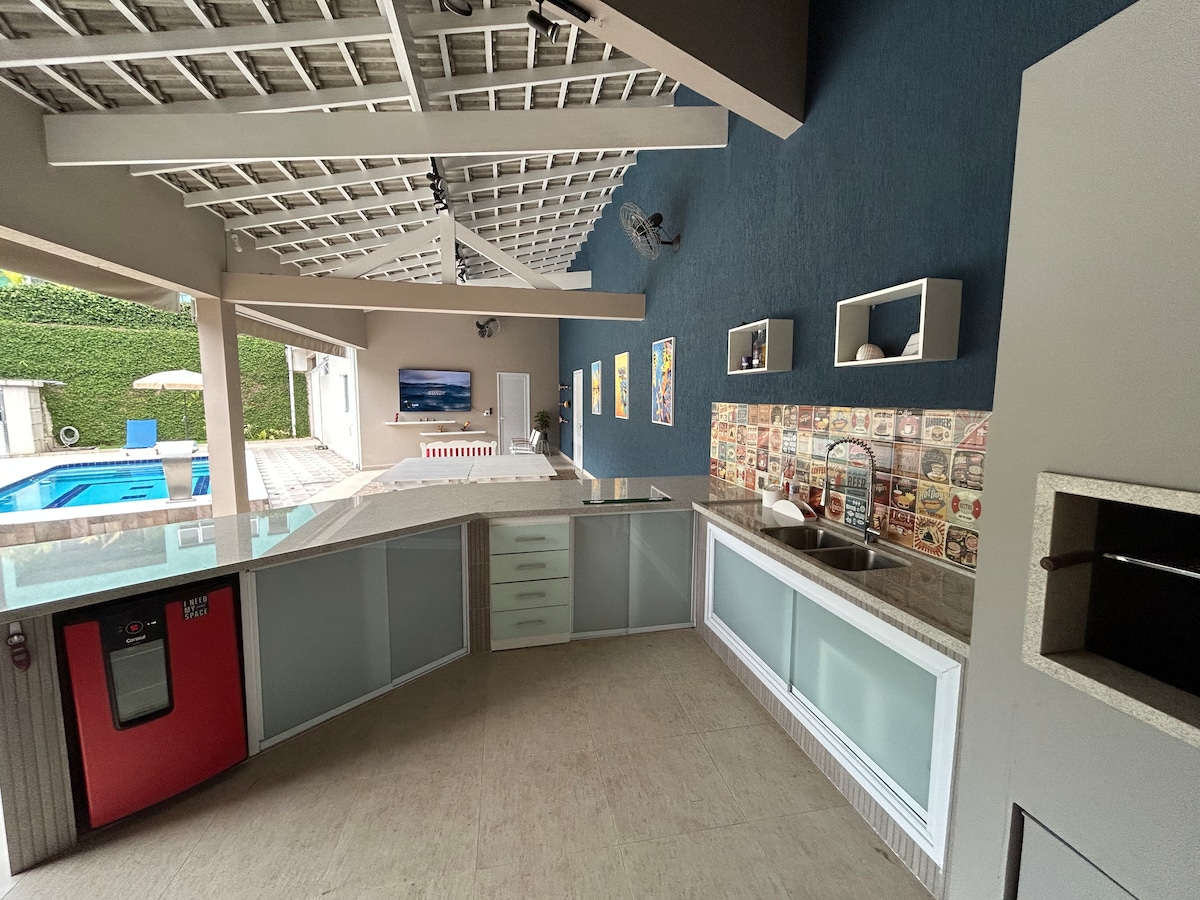 A propriedade é dividida em 2 casas independentes. Uma casa acomoda os hóspedes, e a outra ao fundo reside os proprietários/anfitriões. A Casa dos hóspede tem piscina aquecida exclusiva, espaço gourmet c/churrasqueira, banheiro, geladeira, cervejeira, forno a lenha, fogão e air fryer. Oferece 2 suítes c/cama de casal, sala de TV c/sofá-cama e sala de jantar. Ar condicionado nas 2 suítes e sala de TV. Conta com espaço para Home Office c/sofá-cama e ventilador. Garagem coberta p/2 carros