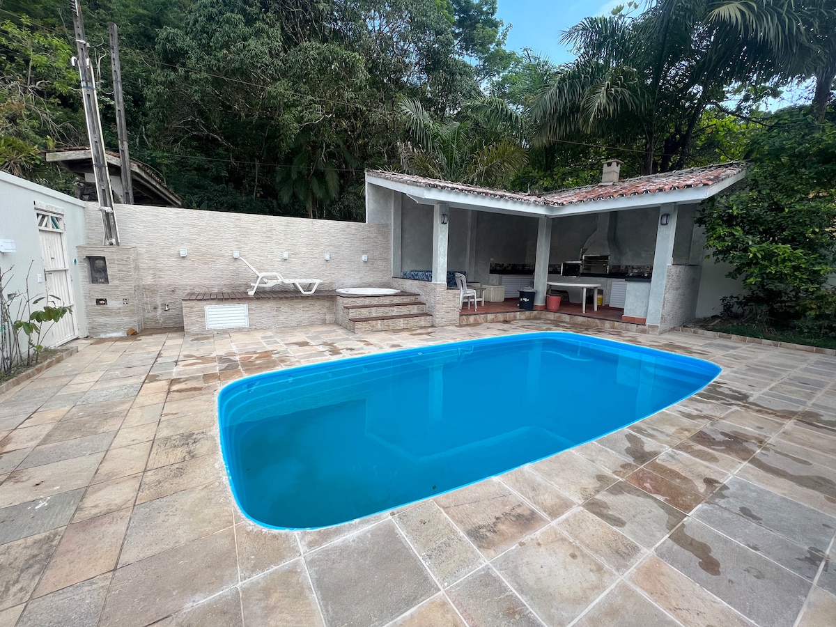 Very comfortable house, 150 m2. swimming pool, fruit trees, large lounge, barbeque place, coal oven, three ensuites, four bedrooms, hamocks, parking place for 4 cars, gourmet room with airconditioning. All in a nice condominium, within the Atlantic forest, with private entrance, in a fenced house. Besides the nice sandy beach, 2.5 km from the house, the district offers nice waterfalls too. Ideal for friends and families!!! Three en-suites and a bedroom with air conditioning.