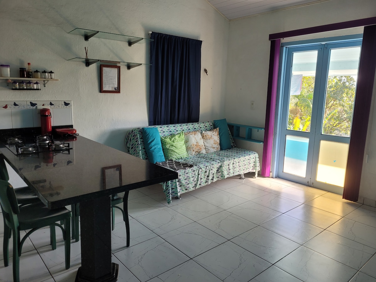 Apartamento aconchegante de frente para o mar. (50 metros) Linda vista do nascer do sol, da sacada e janelas. Praia familiar, ótima para crianças, tendo a opção de surf (lado esquerdo) e caminhada até o fim da praia (lado direito) para pescar, ver tartarugas e animais marinhos. Várias opções de lazer, entre elas: Banana-boat, passeios de escuna até as ilhas próximas. Redondeza com boa estrutura de mercados, farmácias, quiosques e restaurantes próximos, etc. Não precisa usar carro.