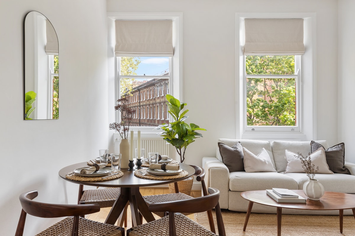Elegant 1-bedroom Chelsea apartment with oak floors, calming interiors, full kitchen, and access to a quiet communal garden. Just 2 minutes from King’s Road and a short walk to Saatchi Gallery, museums, and Chelsea Physic Garden. Peaceful and stylish with secondary glazing to bedroom and lounge for a peaceful stay Superfast Wi-Fi, Smart TV and great transport links via South Kensington & Sloane Square stations Please remove shoes indoors A perfect London base for couples or solo travellers.