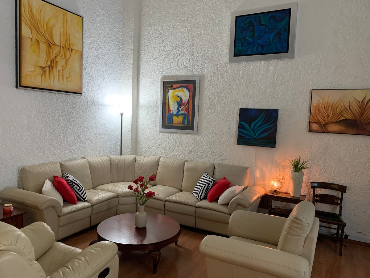 Loft abierto, gran ubicación en uno de los barrios más bonitos de la Ciudad de México, recién renovado y totalmente amueblado, cerca del metro, parques, museo y restaurantes. -Tomamos las medidas necesarias para tener un espacio limpio y confortable. -Al llegar encontrará un kit de desinfección. -Guardia del edificio 24 hrs, Roku tv, puedes usar las apps de la smart tv. -Agradable sala de estar, cocina totalmente equipada, sofá cama, cama queen size. -Excelente lugar para trabajar cómodamente.