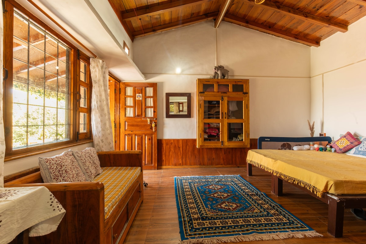 For 2 adults and two kids. A two- storeyed, A shaped Glass- Wood- And- Stone studio villa amidst an Avocado canopy and a small Kiwi vineyard and quite a few rare flower plants in the premise of our ancestral property. Vinatge setting, a fireplace, a freshwater spring, many ponds, a hammock and the constant chirp of birds to keep you company. Ideal for trekkers, readers, bird wacthers, nature lovers, meditation practitioners or people just looking for a quiet spot in a forest.
