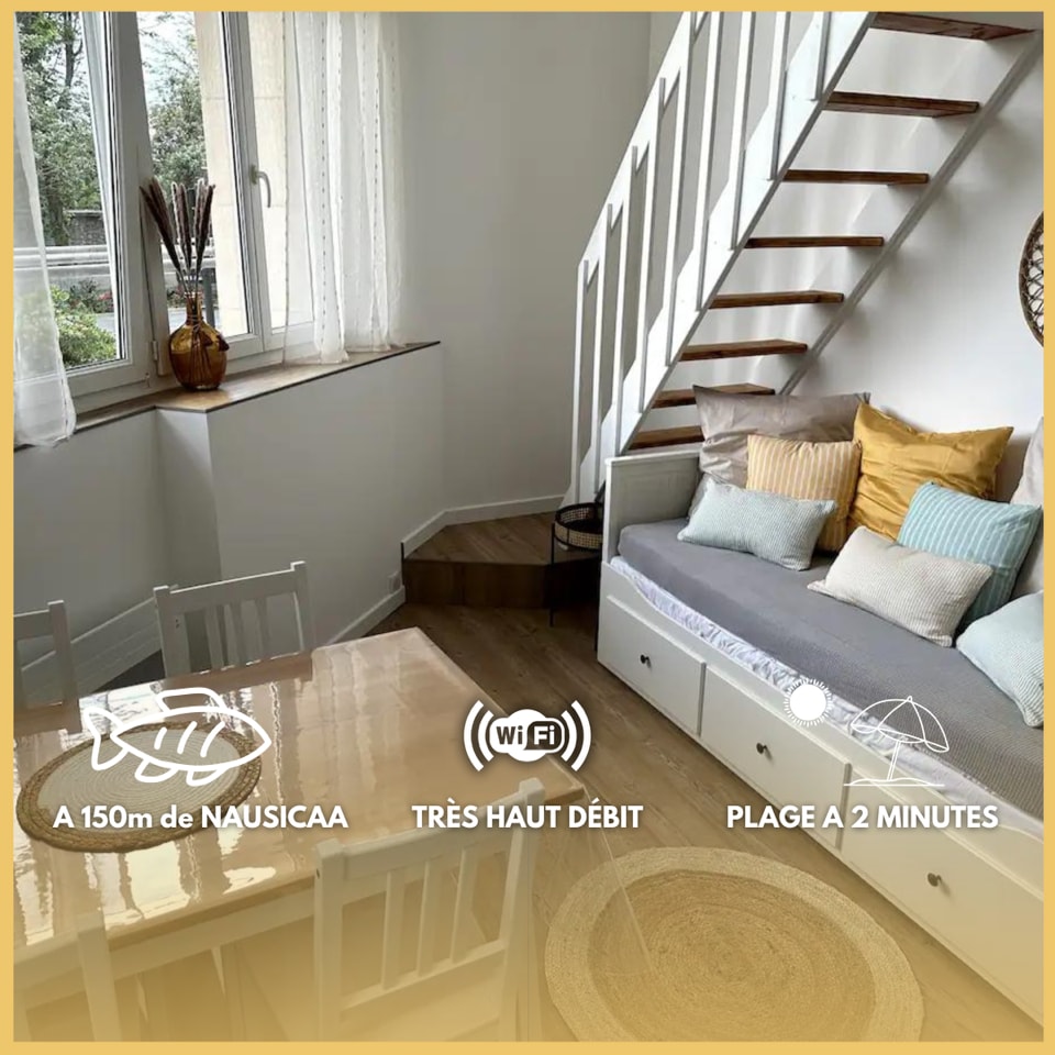 L'appartement de 35 m2 se situe au 3 ème étage sans ascenseur avec une vue magique sur la mer, il se trouve aussi à 5mn à pieds du plus grand aquarium d'Europe NAUSICAA, À 15 mn du centre ville et du port de pêche, et à 3 km de wimereux. Un arrêt bus sur une ligne direct vers sncf en bas de l'immeuble celui-ci possède 1 chambre avec 3 couchages 1 lit double+1 lit simple en mezzanine+1 clic clac dans la pièce commune,la kitchenette est petite simple et fonctionnelle,1 SdB douche, toilette séparé,