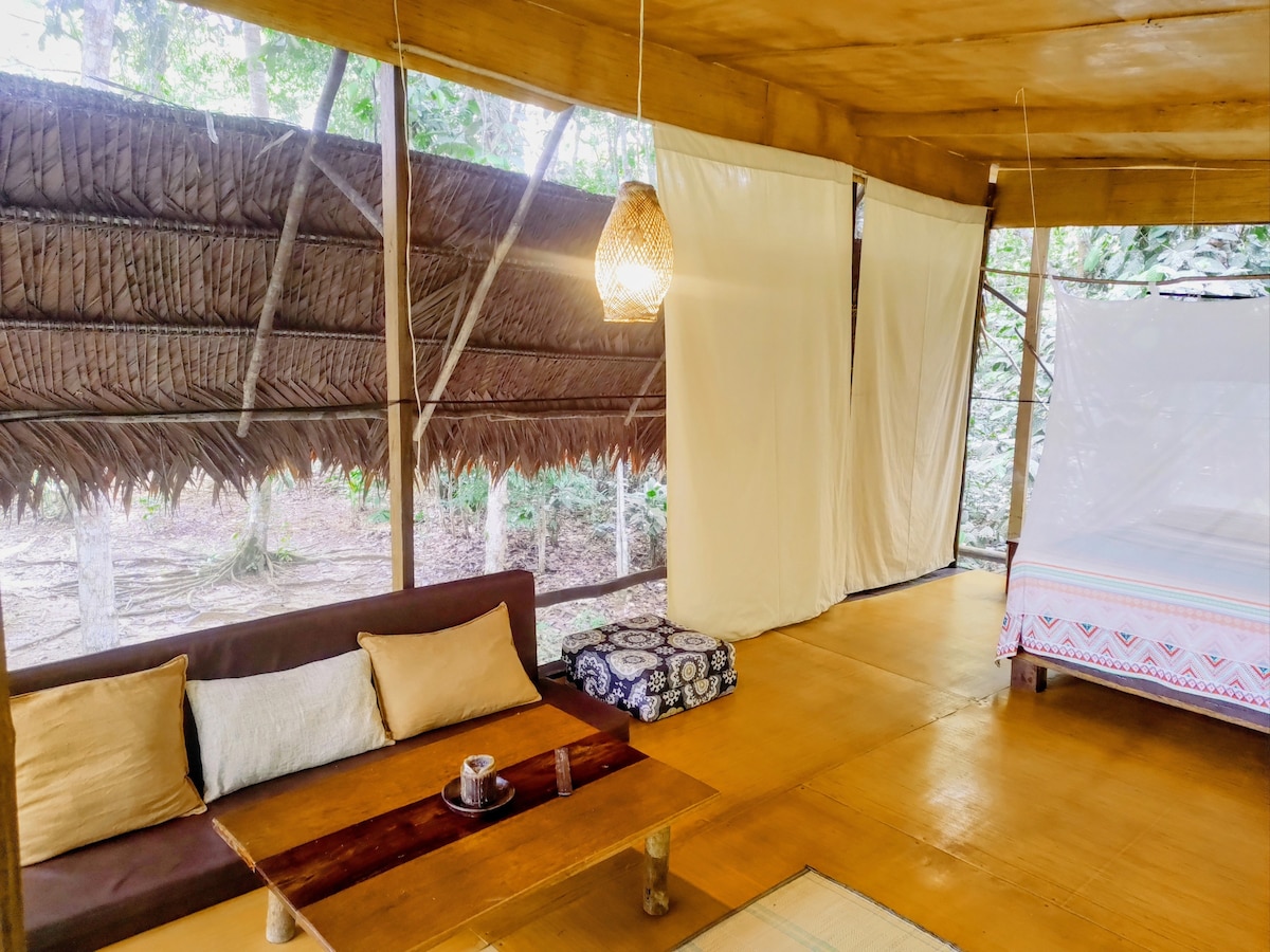 surrounded by nature in comfortable cabin of your own secluded yet close enough.rising in the morning being observed by curious monkeys from close by trees or joining the fun with others in a pool and deck while awaiting delicious meal to come ? perfect place to integrate after your retreat, diet or simply enjoy end rest while visiting jungle :)rest room, outdoor showers, electricity, wifi, pool(natural bit of leaves and algae) gym and communal area and grill are 1 minut walk from your cabin :)