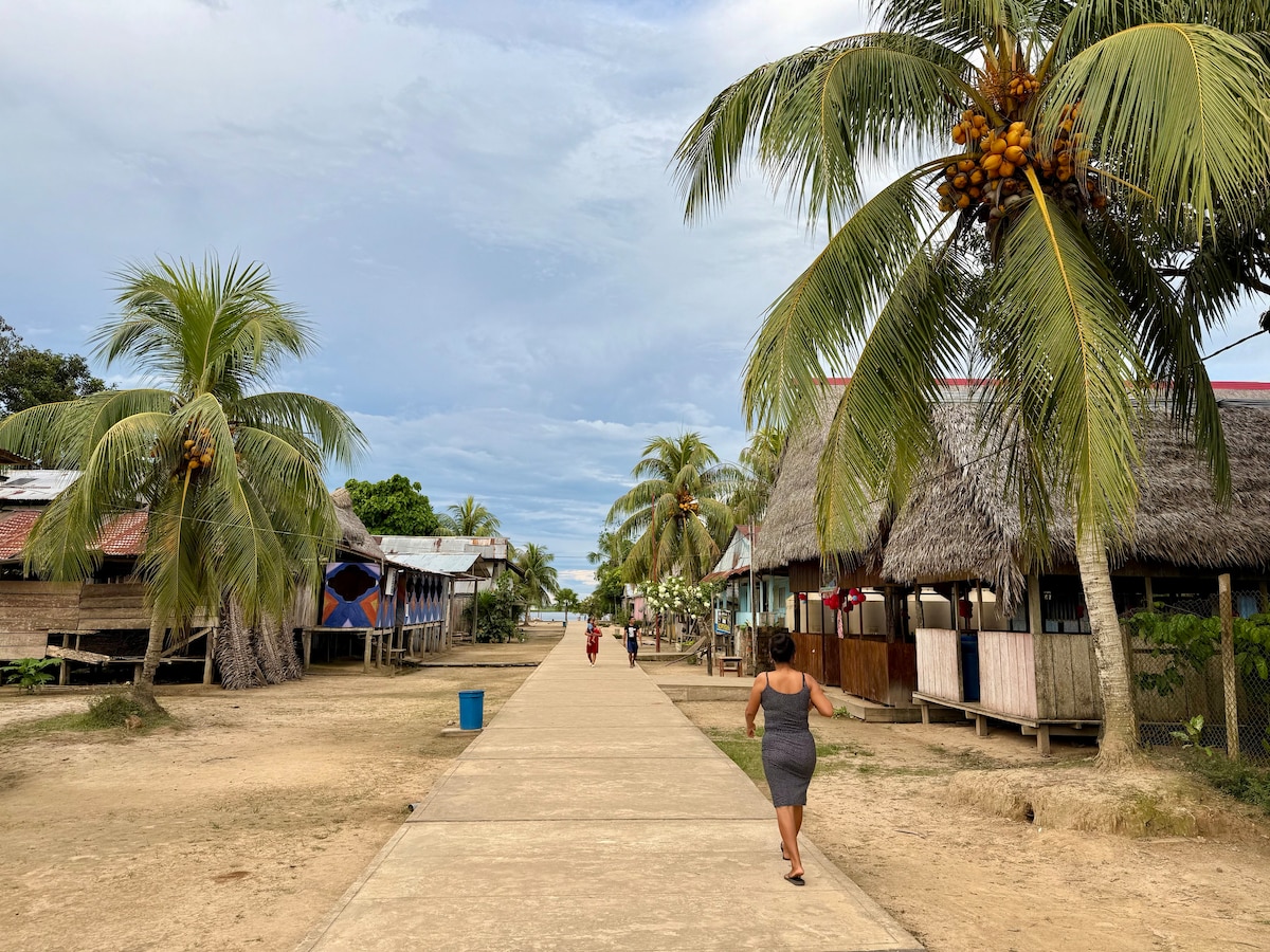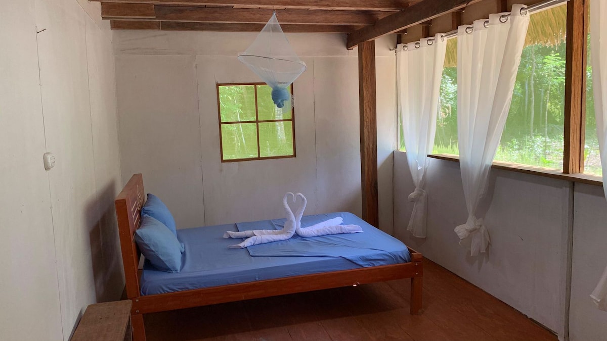 Confortable private house surrounded by jungle..spring matrace to rest well..futon with table downstairs..WIFI (STARLINK) Short walking distance access to shower and bathroom .. shared chill area indoor .. gym .. Maloca with indoor fire pit .. terrace with 9000L swiming pool (natural bit of leaves and algae) Located out of town in jungle .. access to town walking or mototaxi 10 minuts You can see monkeys spiders and other jungle creatures around here in its natural habitat