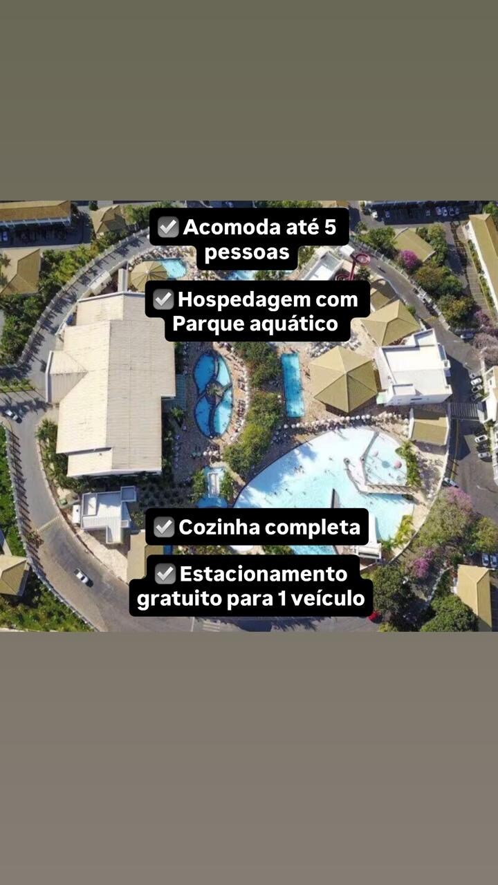 2 quartos com ar condicionado; 8 piscinas de água quente gratuitas (uma delas com escorregadores pra crianças e outra com bar molhado); 2 jacuzzis; e sauna úmida; Cozinha no flat com talheres, pratos, fogão, forno elétrico, geladeira e microondas; Amplo estacionamento gratuito (pra vários carros); 2 Banheiros; Salão de jogos; Academia; Quadra e campo de futebol; Wi-fi no flat, na recepção do condomínio e nas áreas das piscinas; Ao lado do clube Lagoa Termas Parque (dá pra ir a pé)