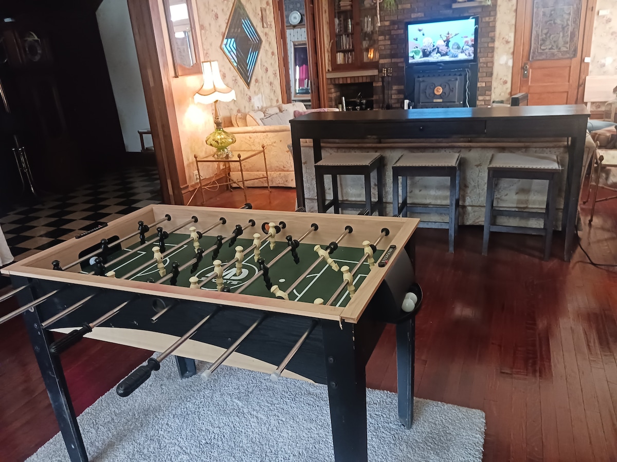Next to the Mississippi River and Close to LDS Temple & Visitors Center Hot tub Deck WIFI 3 fire places Antique claw foot bath tub inside a turret 2 kitchens 6 bunk beds 2 bed rooms Computer and printer Board Games Blue Tooth Speaker Taylor and Mini Taylor guitars Washer and Dryer Foosball Table Play Station 4 Digital grand piano Sacred Indian Burial Mounds in back yard We will consider pets if you are willing to keep them on the first floor only.