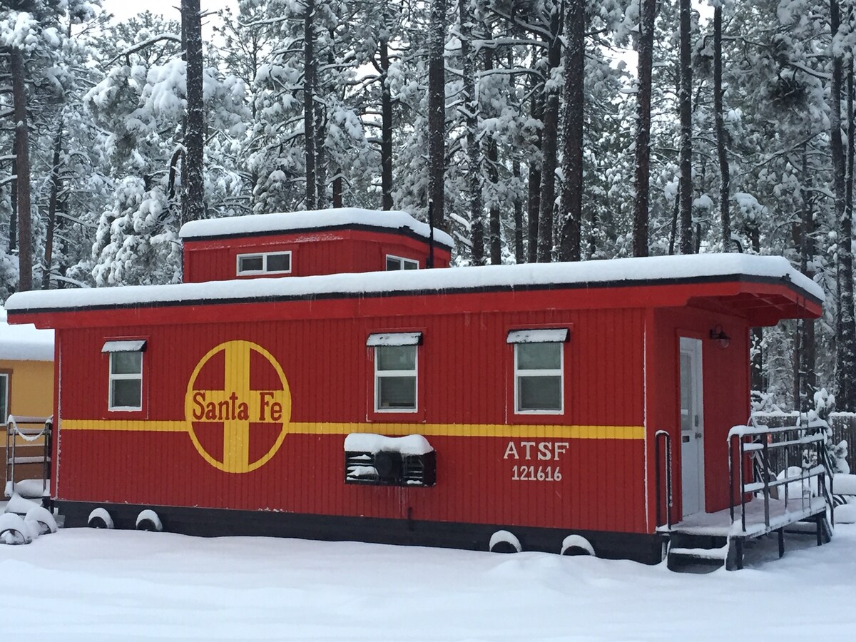 ALL ABOARD!!! Why not stay somewhere unique & fun on your trip? This is not a real caboose, however it is a 350 sq. ft private living space made to look like one : ) Our beautiful, quiet, & clean property is nestled in the tall pines of Pinetop & borders the National Forest on a paved, dead end street. Hiking trails are mere seconds from the front door, yet it is still close to town. A private sitting area with an 1800's facade is for guest use. This cabin will sleep 2. No cleaning fees!