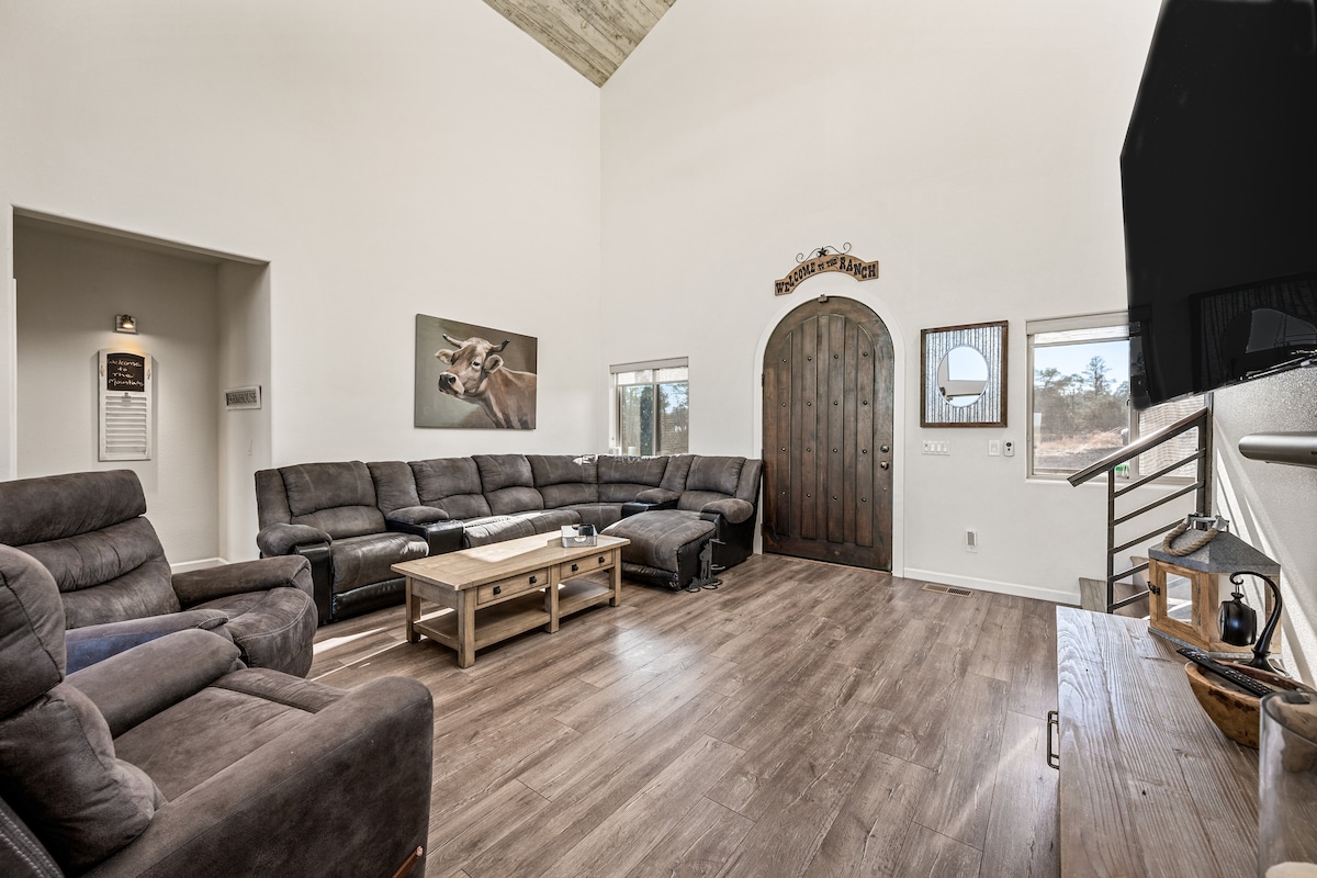 Take it easy at this unique & charming getaway in Pinetop. Secluded & comfortable, indoors & out. Full kitchen amenities and laundry, plus outdoor lawn area & easy parking. Leave the tension behind and enjoy the stress-free environment up in the cool pines! Enjoy the views of the trees and sunsets from this space! 1 bedroom w/ queen bed. Nice comfortable & oversized sectional Couch. Wifi & Smart TV. Tap water is very good here. *During winter weather 4x4 usually required