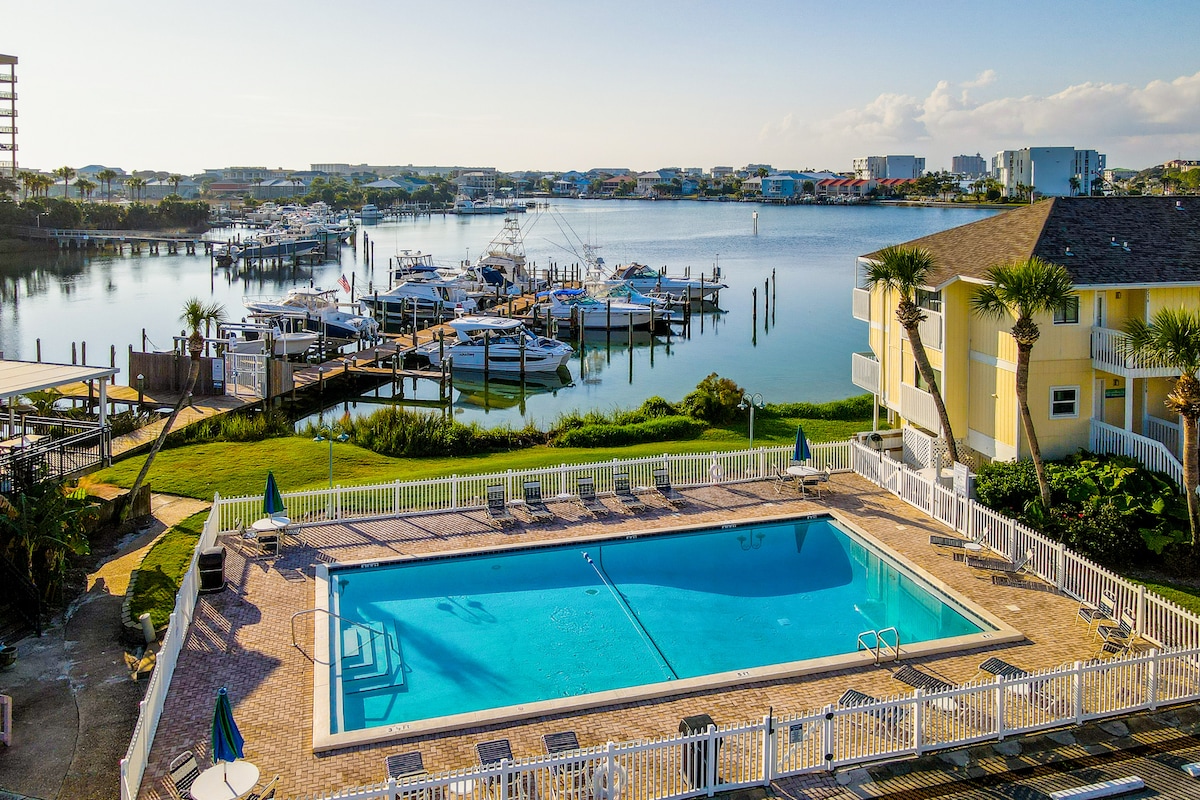 This sunny Fort Walton Beach getaway is perfect for small families, couples, and businesspeople alike, with a small private beach, two shared pools, and more! With shopping and dining just a short walk away, you'll love your new home away from home for four's great location, almost as much as you'll love relaxing in the pools or boating at the dock! Okaloosa Island's boardwalk and pristine beaches are just a short drive away.