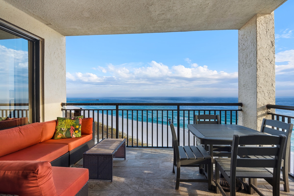 Spacious 3/3 beachfront living at Beach Colony East on The Gulf. Large panoramic windows and private circular beachfront balconies. Each bedroom has a private bath. Large open concept living area is recently remodeled and has "beachy" decor. Seating for 8. Smart tvs in living room, queen and twin rooms, with DirectTV. Tranquil, sea-side drive along uninhabited Gulf Islands National Seashore from Navarre Beach to Pensacola beach. May occasionally see the Blue Angel's or Fat Albert do a fly-by.