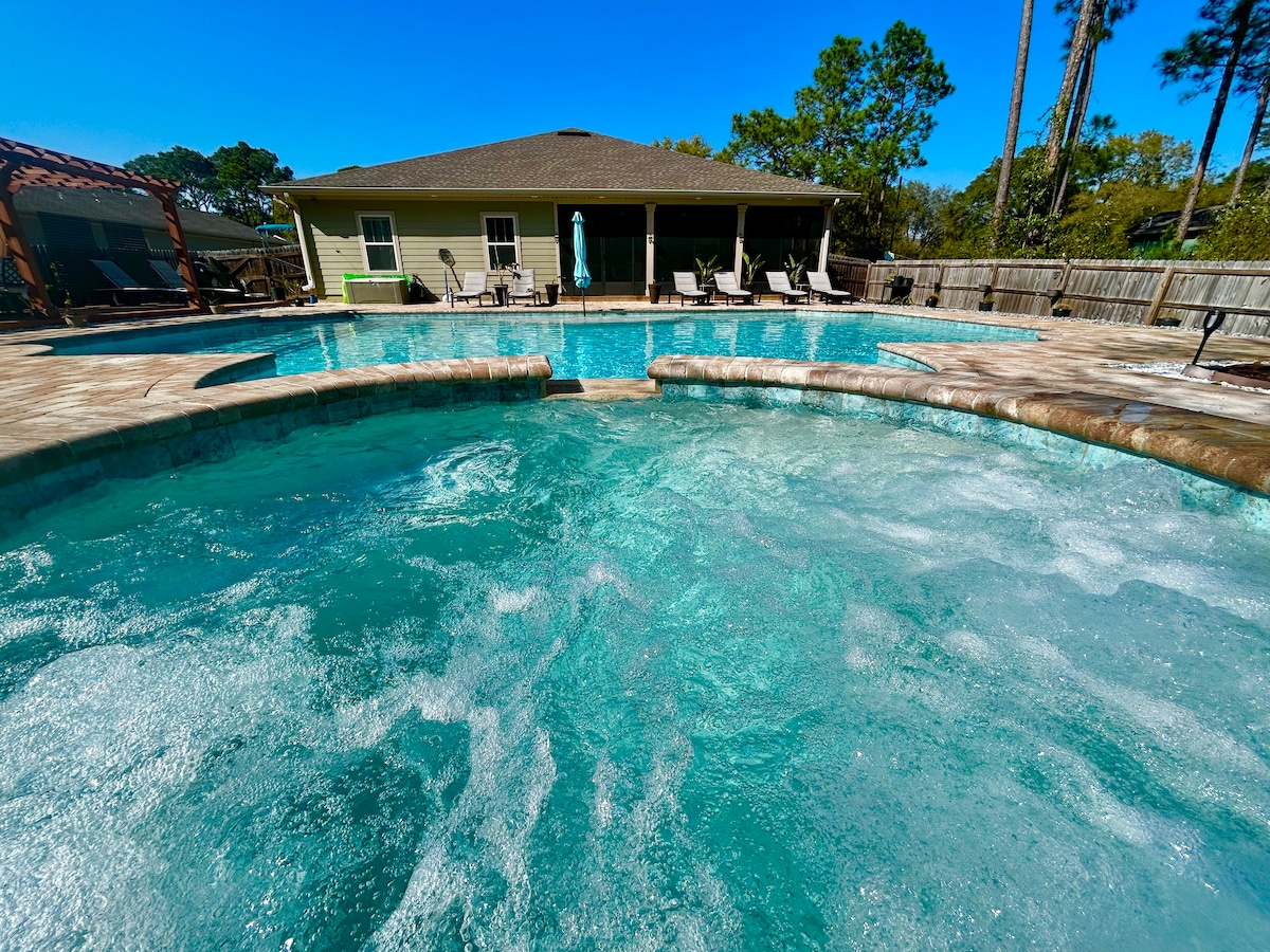 Experience the Navarre Retreat - a unique 5 bedroom oasis offering a range of amenities for your ultimate relaxation. Dive into the new heated saltwater pool, unwind on the expansive deck or in the sunroom, gather around the fire pit under the stars. Just a short 3 mi drive to Navarre beach. Plus easy access to Opal, and other pristine beaches. With a fully equipped kitchen, beach gear, cooking essentials, and entertainment options, this home ensures a seamless and unforgettable getaway