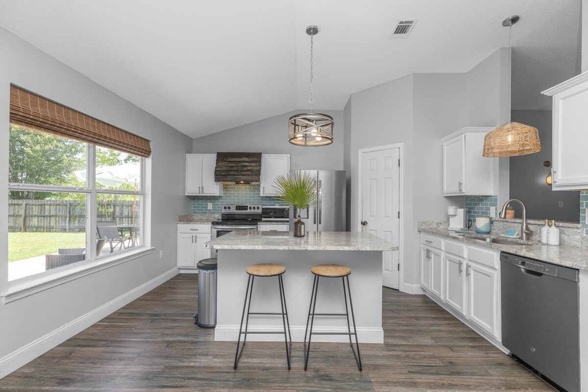 Luxurious Beach Home is newly renovated, located in the heart of Navarre. Surrounded by grocery, shopping, attractions, and many great dining options. The bay is a 5 minute walk and it's a five minute drive to the Navarre Bridge where our sugar white sand beaches and beautiful water views for miles await you. This 3 BR each with a TV and 3.5 bathroom home features plenty of space for a family or couples to spread out, including a large back deck with grill and huge covered front porch.