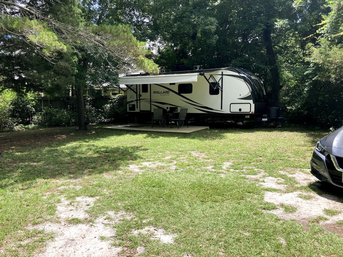 Start your affordable vacation with us only minutes to the emerald waters and white sands of Navarre Beach. 2021 32' RV with all the amenities of home. Come back from the beach and enjoy stories around the fire pit. Plenty of space for the kids to play catch, games or just run around. Stove/oven, microwave and refrigerator in the kitchen. Central heat/air, water, sewer and 50 amp electric service. Full size regular mattress, 3 bunkbeds along with a pullout couch.