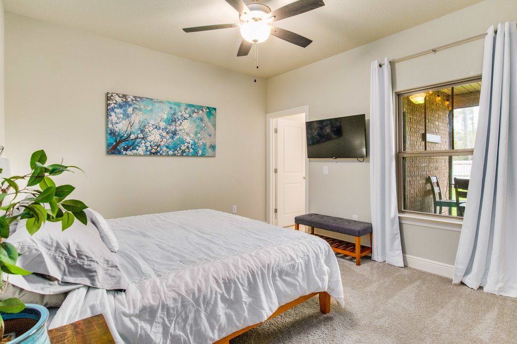 Luxurious Beach Home is newly renovated, located in the heart of Navarre. Surrounded by grocery, shopping, attractions, and many great dining options. The bay is a 5 minute walk and it's a five minute drive to the Navarre Bridge where our sugar white sand beaches and beautiful water views for miles await you. This 3 BR each with a TV and 3.5 bathroom home features plenty of space for a family or couples to spread out, including a large back deck with grill and huge covered front porch.
