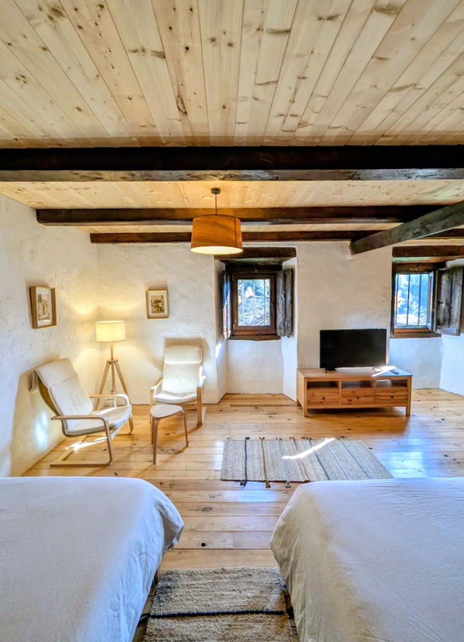 Ideal para parejas, es un Loft diáfano de 40m2 con un sofá cama que permite alojar cómodamente a un adulto o dos niños adicionales. Tiene una acogedora estufa de leña, una cocina y baño completo y una maravillosa bañera de hidromasaje para una experiencia de relax incomparable. A parte del balcón, tiene también una terraza privada con mesa de exterior y barbacoa, además de acceso a las zonas comunes del jardín con juegos de exterior y tumbonas. Nº de registro: XSS00818