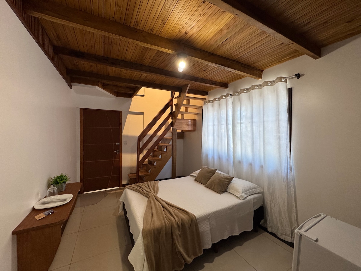 🌿 Refúgio tranquilo próximo ao aeroporto, no caminho de Balneário Camboriú e Beto Carrero. Clima de casa de campo, ideal para descansar ao som da natureza. Suíte aconchegante com mezanino e duas áreas de dormir, perfeita para casal ou pequena família. Fácil acesso a restaurantes, mercados e farmácia. Integra o Bosque da Coruja, que eventualmente pode receber eventos pontuais, sempre respeitando horários. Ideal para casais, pequenas famílias e hóspedes que buscam tranquilidade.