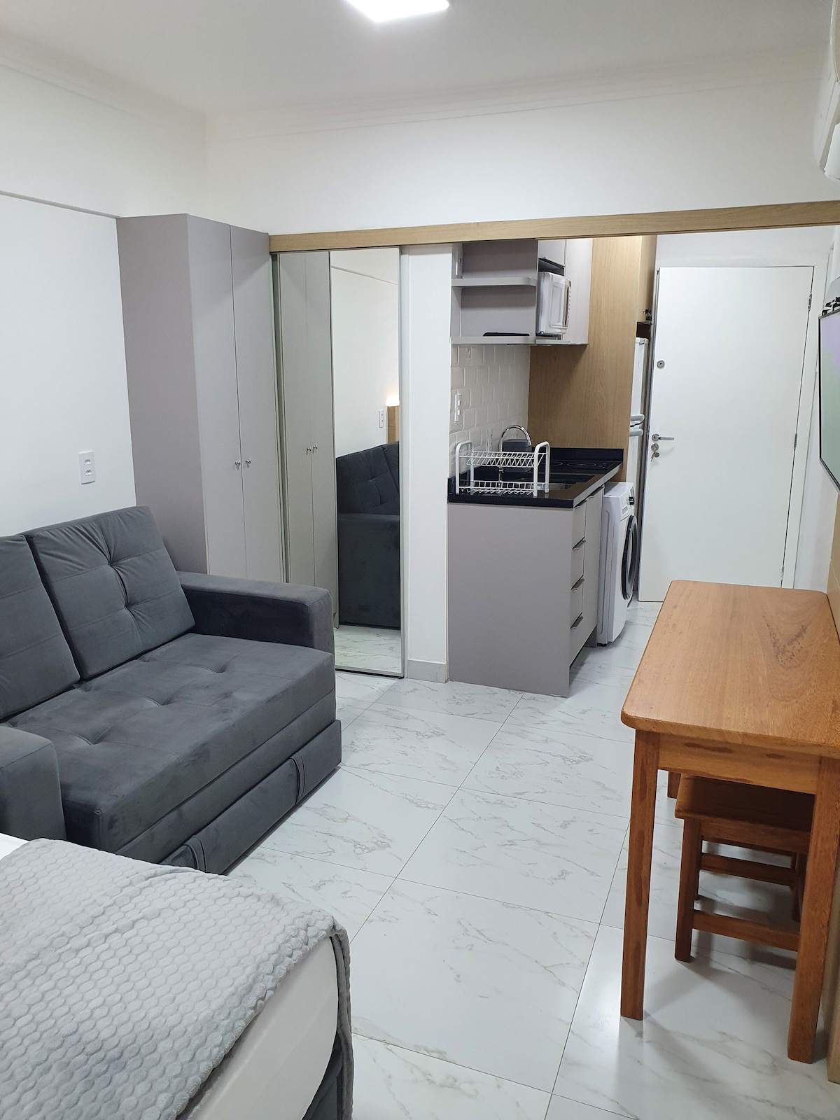 O apto tem um quarto Tipo Estúdio, com Cama Quem, na sala um sofá cama e deixo um colchão avulso, Ele é ideal para Casal com filhos, Cozinha com fogão de indução c 2 bocas, equipado com todos os utensílios Ar condicionado quente e frio no quarto, mas ele aquece ou refrigera o apto tdo, Forneço roupa de cama e Banho, cobertores, O PRÉDIO TEM UMA BOA VAGA DE GARAGEM INCLUSA DENTRO DO PRÉDIO A voltagem da energia em SC é 220vtS