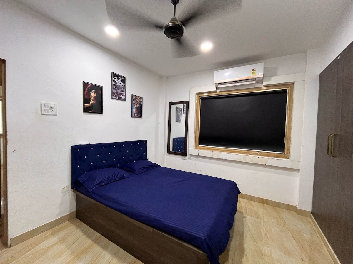 Relax and enjoy your stay in a space designed to feel just like home. Peaceful area for comfortable stay. Recommended for mind work, brain storming, best for family and couple. Soothing ambiance with decorative walls. Walking distance from station. Guests can buy essentials from nearby Big Bazaar. A king size bed for two person in each room. A fully furnished flat with all necessary requirements.