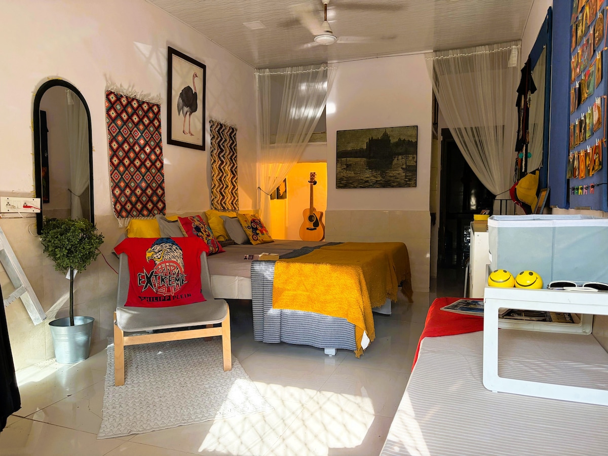 Welcome to our exclusive South Mumbai Airbnb retreat, nestled in a posh neighborhood. Immerse yourself in luxury in this charming bungalow, a gem capturing the essence of Bombay living. The private room is a haven of sophistication, equipped with a kitchen. Step outside to an enchanting outdoor seating area surrounded by a lush garden with a breathtaking sea view. The prime location offers a rare opportunity to relish the Arabian Sea's beauty from your accommodation.