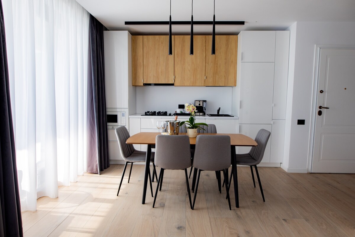 Apartamentul are doua camere, un dormitor cu pat matrimonial si living cu canapea extensibila (rezulta un pat mare pentru doua persoane), Tv smart in ambele camere, aer conditionat si Wifi. Bucatarie este open space, dotata cu frigider, plita electrica, cuptor cu microunde, filtru cafea, cana electrica si vesela. Apartamentul este utilat cu toate cele necesare, masina de spalat, fier si masa de calcat, uscator de par, lenjerii, prosoape, papuci