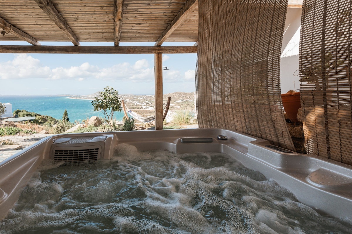 Panoramic sea views and a private hot tub on your own balcony. Flat Triton, part of Enosis Apartments, is located on the top floor at the well-known Agia Anna Beach of Naxos, just steps from the long sandy shore and the crystal clear blue waters. This Cycladic-style studio features a spacious private balcony with a double pouf sunbed and open views over the Aegean Sea. A well-positioned seaside stay offering privacy, comfort, and direct access to one of Naxos’ most popular beaches.