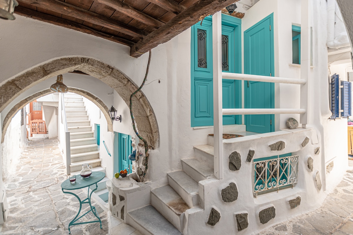 A unique aesthetic apartment with a beautiful private patio and lots of art touches, located in a picturesque neighbourhood in the heart of Naxos Town that can host up to 5 guests. Located 10' on foot from the Port, 1'-2' from the Market and other places of interest (castle, museums, etc) and entertainment (bars, restaurants, etc). If you travel without a car, no worries; the closest bus station to the most popular beaches and villages is at 3' on foot. Free parking space at 3' on foot!