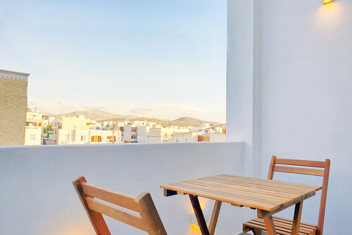 With a view of the city, the castle and the old town of Naxos, the roof garden of the accommodation will offer you unforgettable images, especially at sunset. The accommodation is located right in the center of town, with easy access on foot to the most important attractions of Chora, the Temple of Apollo (Portara), the Castle of Naxos and the Archaeological Museum of Naxos, as well as shops and more. It is fully equipped with everything you need to have a comfortable and beautiful stay!