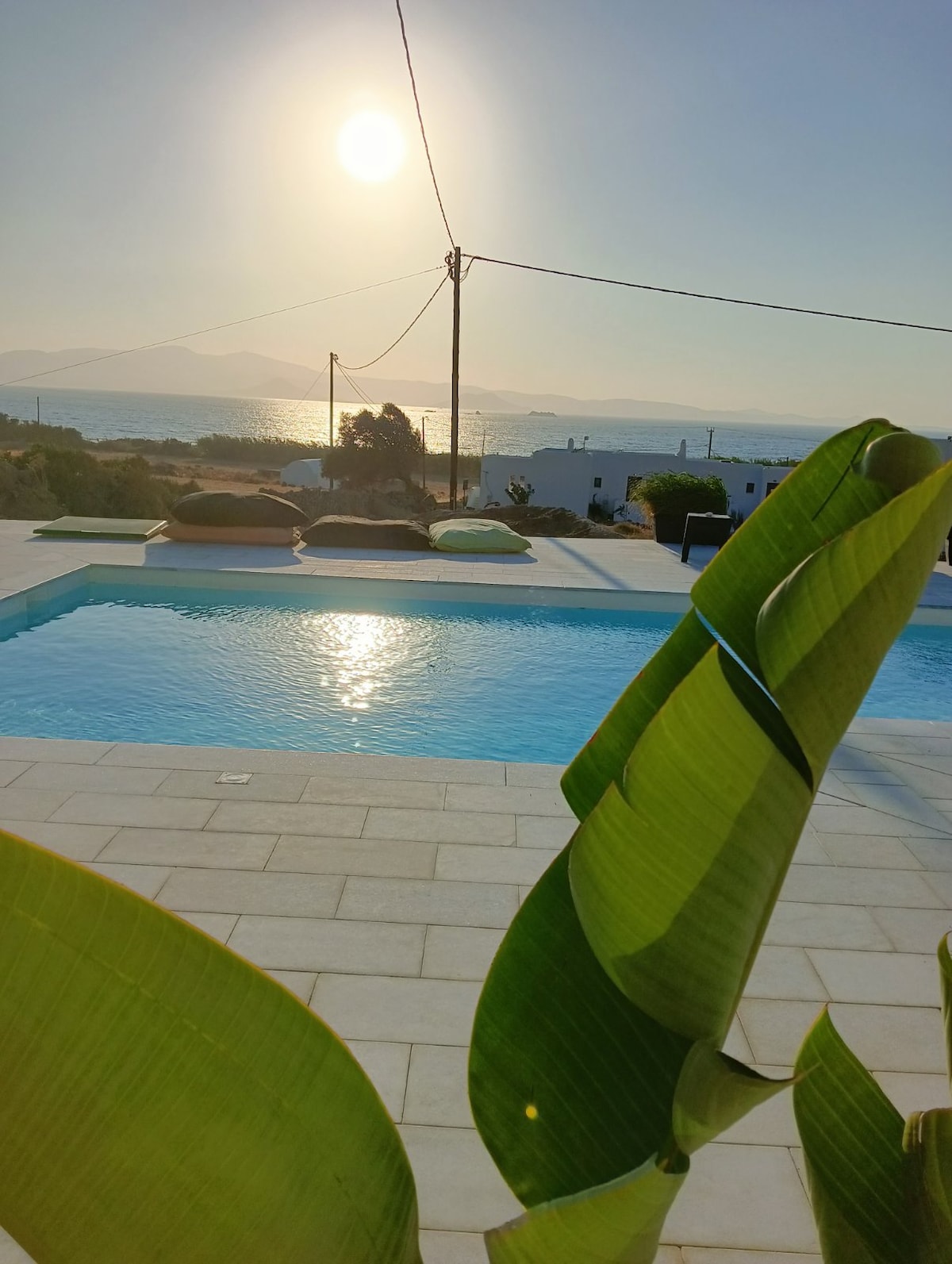 You can enjoy a side sea view and as you can see in the photos it is 15 steps from the sea. 10 meters away there is Sun Kyma café- bar-restaurant, where you can enjoy your meal you want during the day cocktails or breakfast . Next to the rooms you will find FLISVOS watersports club as well as a lovely sandy beach with sunbeds. You will find my place 10-15 minutes walking from the center of Naxos town (Chora) , 10 minutes by car from the port of Chora and 30-40 minutes walking with luggage.