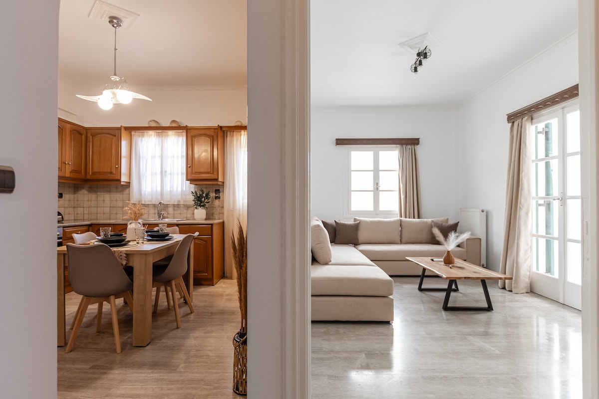 It is located in the center of Naxos, in the Grotta area. Five minutes walk from the port. Suitable for families. Accommodates up to 6 guests 3 bedrooms, 1 bathroom, 1 kitchen, 2 balconies. It has: 3 smart TVs, 3 air conditioners, kitchen, refrigerator, washing machine, five beds (1 double and 4 singles). Close to attractions, restaurants, super market, sea, bus stop, port, central market.