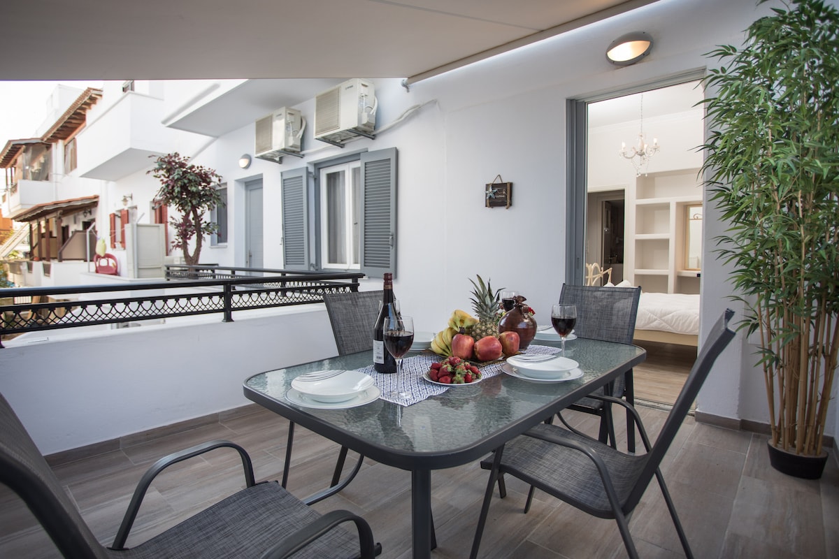 Luxurious 2-bedroom apartment with a large fully equipped kitchenette.Large bath and individual veranda of 25 sqm for relaxation. Ιdeal for families but also for up to 5 people.consists of 2 large bedrooms with king size beds, as well as a sofa bed in the kitchen. We are in the center of the city of Naxos just 5 minutes away from the harbor, near to the bus station supermarket and bakery.