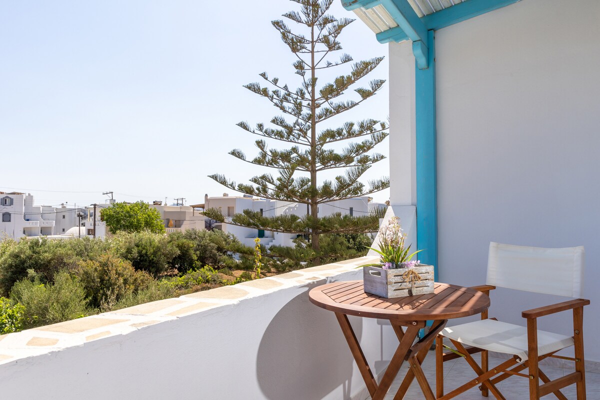 You can enjoy a side sea view and as you can see in the photos it is 15 steps from the sea. 10 meters away there is Sun Kyma café- bar-restaurant, where you can enjoy your meal you want during the day cocktails or breakfast . Next to the rooms you will find FLISVOS watersports club as well as a lovely sandy beach with sunbeds. You will find my place 10-15 minutes walking from the center of Naxos town (Chora) , 10 minutes by car from the port of Chora and 30-40 minutes walking with luggage.