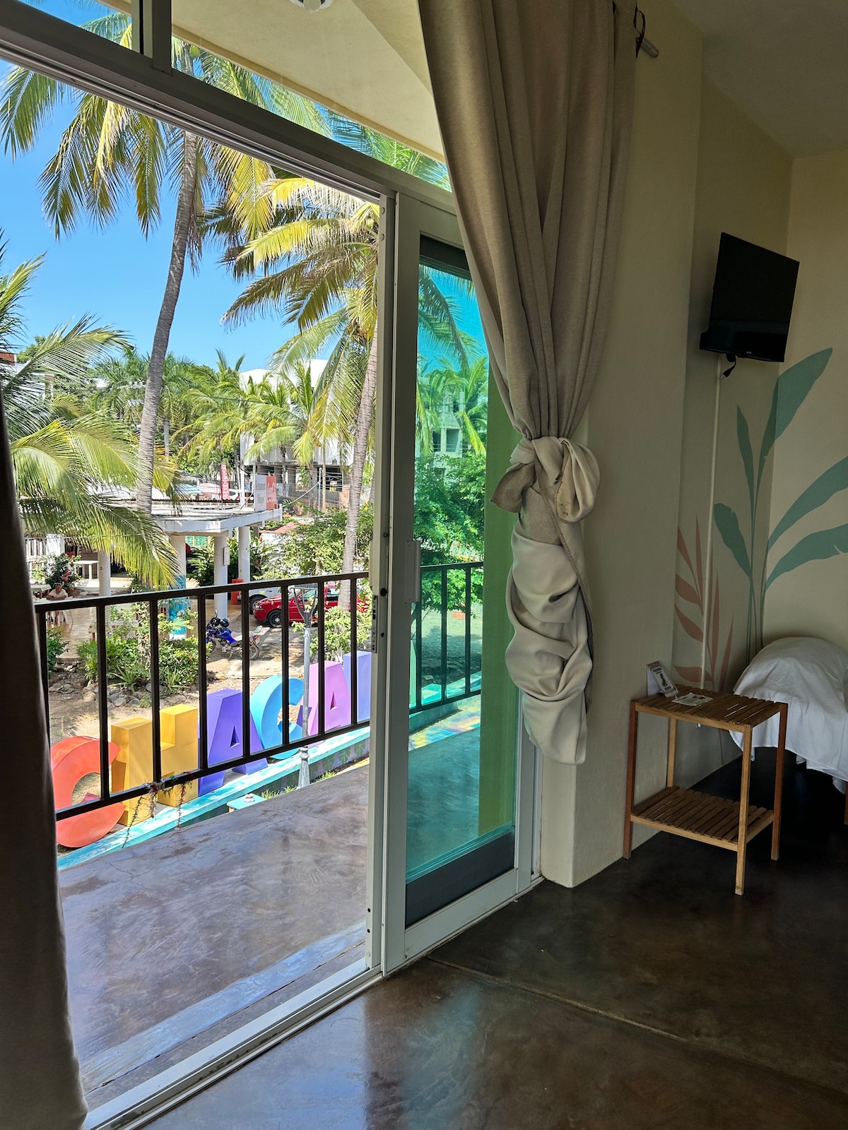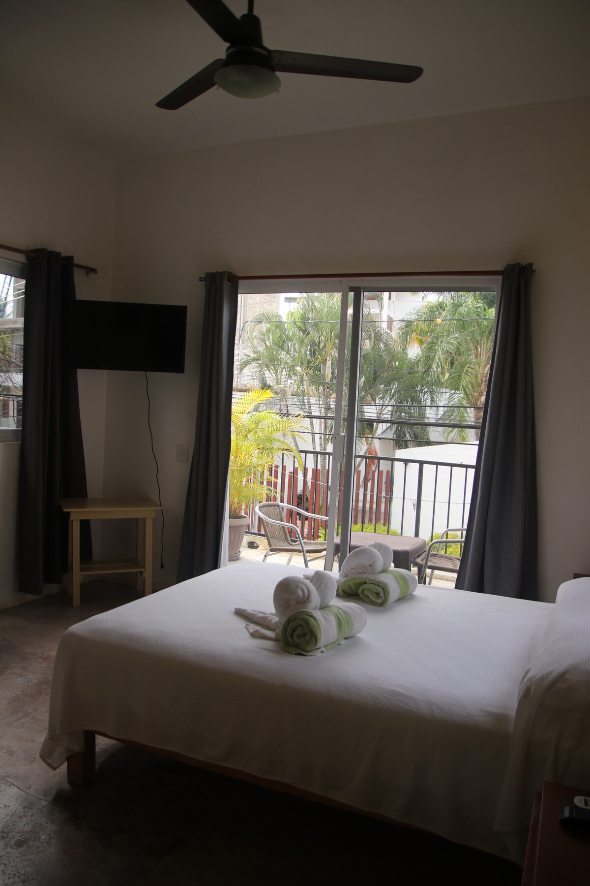 The most beautiful one with a view of the beach! The Sea Suite on the second floor of the Chac Mool Hotel and Restaurant, has a king size bed and a sofa bed for 2-3 people. A nice shared balcony with wooden chairs and flowers frames the entrance, from there, you can contemplate the beautiful view of the sea. It has a bathroom, A/C, ceiling fan, Smart TV, beach and bath towels. The stay includes standard breakfast. Pets are welcome with a minimum charge of $200MXN per night per pet.