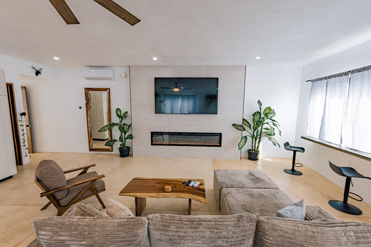 Un estilo de hacienda mexicana con un toque elegante y rústico Casa Leòn, te encantara! Con una acogedora iluminación, muebles de diseño y obras de arte Wirrarika le dan un estilo encantador. En el exterior te envolvera una hermosa vista del bello jardín y la magia del Gran Árbol de la Vida. Y la gran joya de la corona, una fresca palapa rústica estilo sportbar que hace unidad con el jacuzzi con hidromasaje para disfrutar con familia y amigos de momentos inolvidables.