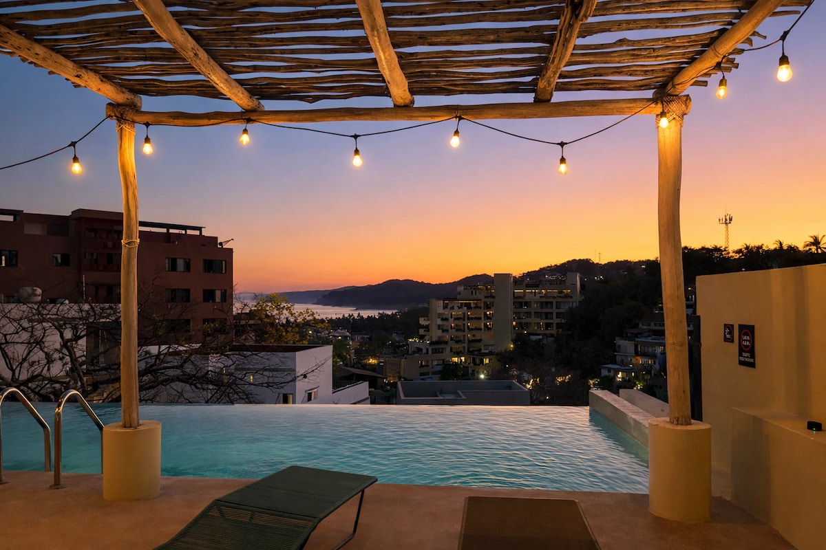 A spectacular PANORAMIC OCEAN VIEW Penthouse Loft steps from the BEACH and MALECON, with your own INFINITY POOL+all services and comforts, fully-equipped kitchen, AC, quality bed, waterfall shower, Wi-Fi, Smart TV, and the BEST VIEWS to admire Incredible SUNSETS and FIREWORKS every night, you may even find some Whales splashing over the Bay from your bed!! Walk to tons of restaurants, shops, art galleries, markets, or sunbathe at the many outdoor spaces, pools and decks... Welcome to Paradise!