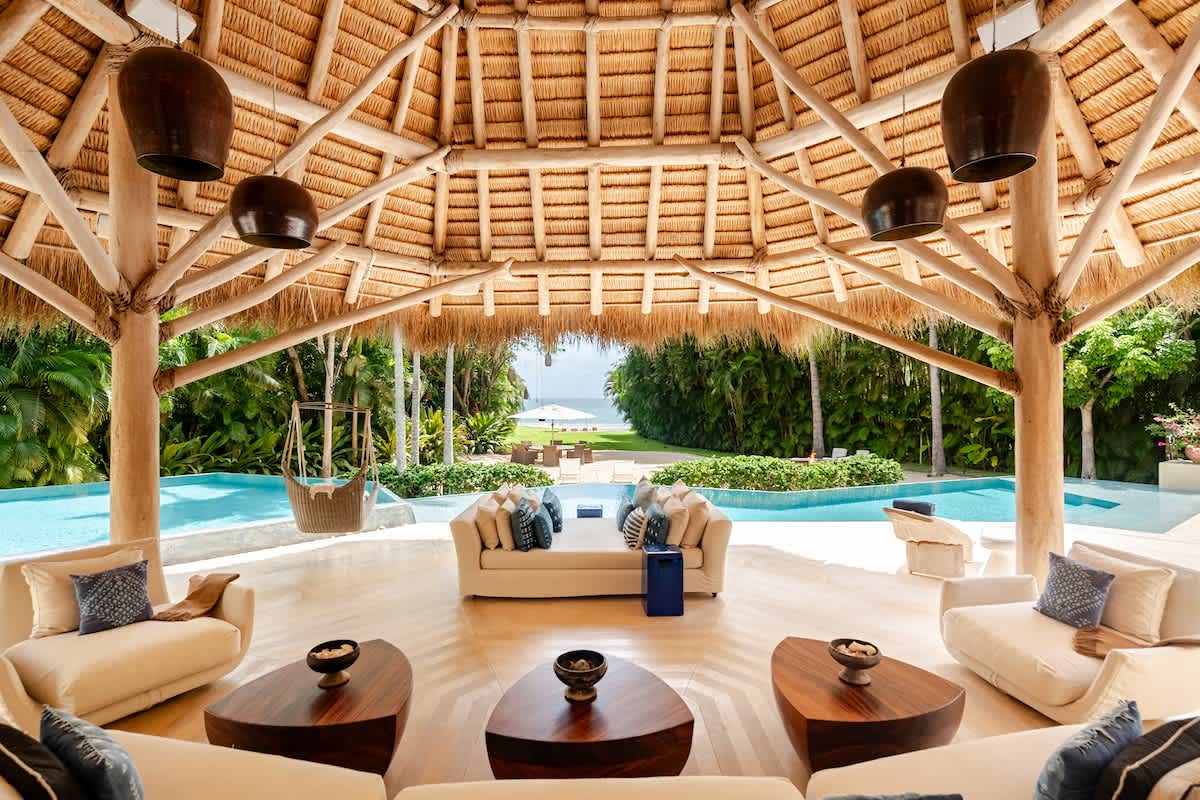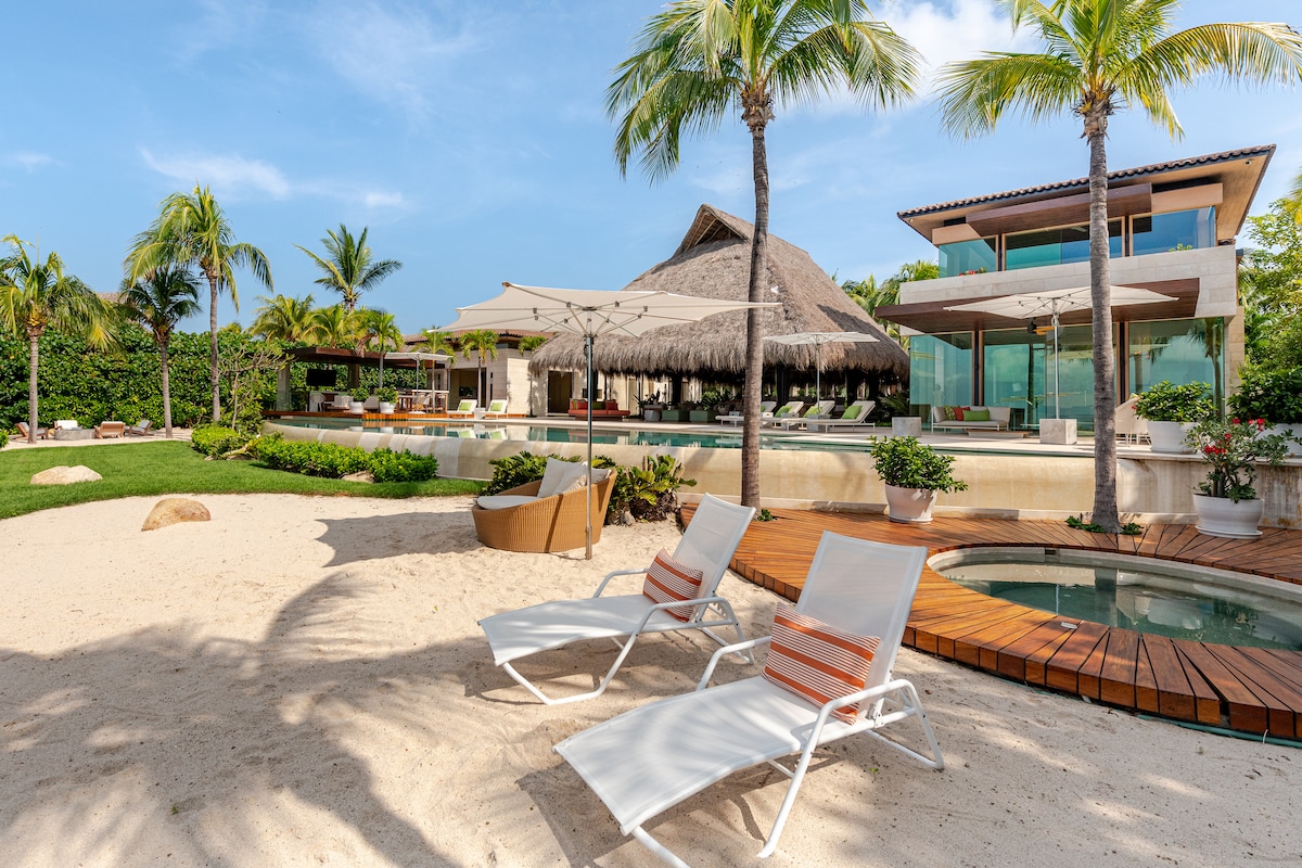Like the waves spill onto the shore, layers of texture and color spill over each other at this waterfront Punta Mita mansion. The fully staffed estate boasts the amenities of a boutique hotel—think beachfront bar and private spa—all housed within gorgeously appointed rooms with details like parquet ceilings. Guests are welcome at 4 beach clubs, and it’s a 7-minute drive to the Litibú Golf Course. Host groups of friends, a family reunion or even a Mexico destination wedding in the villa’s outdoor living areas with the help of the lounging and dining areas, full-service bar, barbecue, and hot tub. There’s one infinity pool for swimming and a separate pool for volleyball, as well as a bocce court, surfboards and paddleboards, and bicycles to borrow. Inside, you’ll find a games room, bowling alley, and golf simulator for fun, plus a yoga area, spa, and home gym for wellness. Beyond the amenities, it’s the style of this vacation rental that truly gives it luxury appeal. Texture on texture—tufted area rug on polished stone floor, gauzy drapes over floor-to-ceiling windows—gives a chic, layered look in the living and dining rooms. It even continues in the fully equipped kitchen, where a vaulted brick ceiling arches over stone and wood counters and cabinets. The villa has 6 bedrooms with king beds, including 2 honeymoon-worthy ocean-view primary suites, 2 bedrooms with 2 queen beds each, and 2 bedrooms with 2 twin-over-queen bunk beds each. All 10 bedrooms have ensuite bathrooms, Apple TVs, and air conditioning. Take the 2 provided 6-passenger golf carts to one of 4 nearby beach clubs, where you can introduce the kids to snorkeling in the calm waters off Kupuri Beach Club or have a drink at the Sufi Ocean Club, then pop over to Punta Mita Pier. While the villa gives you a holiday right on the beach, it’s also a 5-minute drive to the jungle-lined trail to the unspoiled white sand and surf break at Playa La Lancha. Copyright © Luxury Retreats. All rights reserved. BEDROOM & BATHROOM • Bedroom 1- Primary: King size bed, Ensuite bathroom with stand-alone shower and bathtub, Dual vanity, Walk-in closet, Safe, Ceiling fan, TV room, Apple TV, Lounge area, Air conditioning, Private balcony with outdoor furniture, Direct access to outdoor area, Ocean view • Bedroom 2- Primary: King size bed, Ensuite bathroom with stand-alone shower and bathtub, Bidet, Dual vanity, Walk-in closet, Safe, Ceiling fan, Television, Apple TV, Lounge area, Office, Air conditioning, Private terrace with outdoor furniture, Direct access to outdoor area, Ocean view • Bedroom 3: King size bed, Ensuite bathroom with stand-alone shower and bathtub, Bidet, Dual vanity, Walk-in closet, Safe, Ceiling fan, Television, Apple TV, Lounge area, Air conditioning, Private terrace with outdoor furniture, Ocean view • Bedroom 4: King size bed, Ensuite bathroom with stand-alone shower and bathtub, Dual vanity, Walk-in closet, Safe, Ceiling fan, Television, Apple TV, Air conditioning, Private terrace with outdoor furniture, Ocean view • Bedroom 5: King size bed, Ensuite bathroom with stand-alone shower, Dual vanity, Safe, Ceiling fan, Television, Apple TV, Air conditioning, Private balcony with outdoor furniture, Ocean view • Bedroom 6: King size bed, Ensuite bathroom with stand-alone shower, Dual vanity, Safe, Ceiling fan, Television, Apple TV, Air conditioning, Private balcony with outdoor furniture, Ocean view • Bedroom 7: 2 Queen size beds, Ensuite bathroom with stand-alone shower, Dual vanity, Walk-in closet, Safe, Ceiling fan, Television, Apple TV, Air conditioning, Private terrace with outdoor furniture, Garden view • Bedroom 8: 2 Queen size beds, Ensuite bathroom with stand-alone shower, Dual vanity, Walk-in closet, Safe, Ceiling fan, Television, Apple TV, Air conditioning, Private terrace with outdoor furniture, Garden view • Bedroom 9: 2 Twin over queen bunk beds, Ensuite bathroom with stand-alone shower, Dual vanity, Walk-in closet, Safe, Television, Apple TV, Air conditioning, Private balcony with outdoor furniture • Bedroom 10: 2 Twin over queen bunk beds, Ensuite bathroom with stand-alone shower, Dual vanity, Walk-in closet, Safe, Television, Apple TV, Air conditioning, Private balcony with outdoor furniture FEATURES & AMENITIES • Cards table • Bowling alley with 2 professional lanes • Golf simulator • Meditation/Yoga room • Two manicure and pedicure stations • Hair wash and blow out area • More under “What this place offers” below OUTDOOR FEATURES • Volleyball pool • Bicycles • High end golf clubs • Surf and paddle boards SHARED ACCESS TO PUNTA MITA RESORT AMENITIES (advance notice required, subject to availability, fees may apply) Included: • Access to St. Regis Sea Breeze Beach Club • Access to Kupuri Beach Club • Access to Sufi Ocean Club • Access to Pacifico Beach Club • Access to Bahia and Pacifico Golf Course with preferred tee-times • Access to Club Punta Mita Fitness center • Access to Club Punta Mita tennis courts • Access to Four Seasons, St Regis, and Punta Mita Beach Club Spas • Ocean access via Punta Mita's pier STAFF & SERVICES Included: • 2 concierges • 3 maintenance staff • Estate manager Extra cost (advance notice may be required): • Babysitter service • Activities and excursions • More under “Add-on services” below